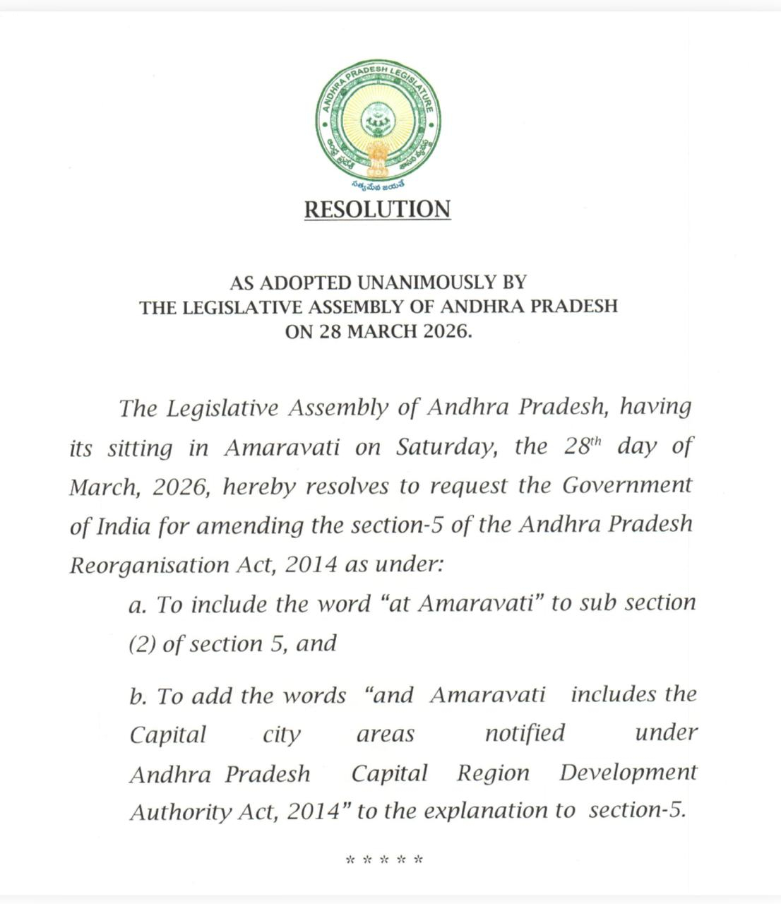 అమరావతికి చట్టబద్ధత కల్పించాలని కేంద్రాన్ని కోరుతూ ప్రవేశపెట్టిన తీర్మానాన్ని ఏకగ్రీవంగా ఆమోదించిన ఏపీ శాసనసభ. ఈ తీర్మానాన్ని కేంద్రానికి పంపిన రాష్ట్ర శాసనసభ.