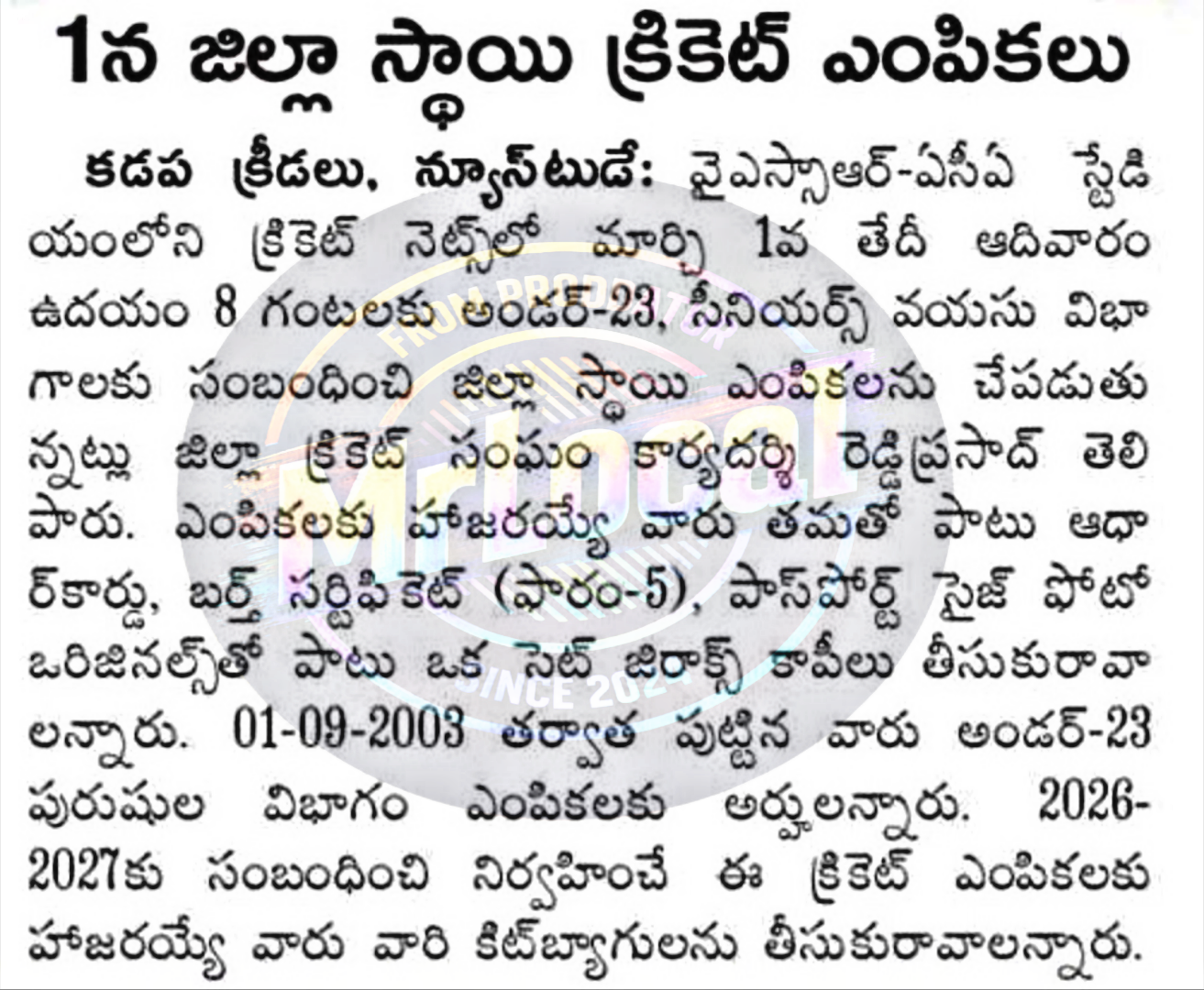 Your dream to represent the district starts here. Utilize this chance to showcase your talent at the District Level Cricket Selections for the 2026-27 season!🏏 Big Opportunity for Kadapa Cricketers! 🌟 Your dream to represent the district starts here. Utilize this chance to showcase your talent at the District Level Cricket Selections for the 2026-27 season!0 Comments 0 Shares 283 Views 0 Reviews -