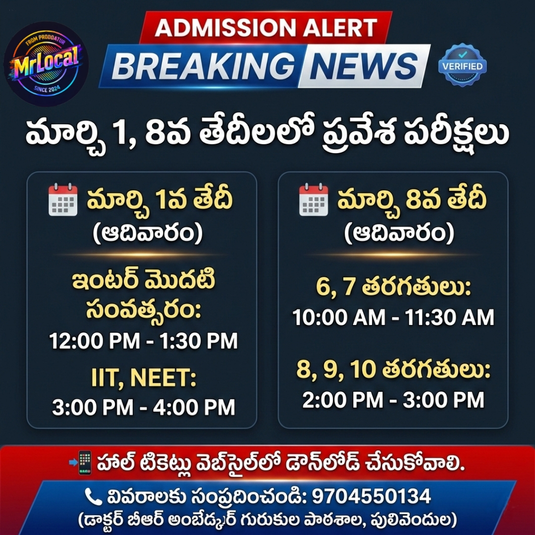 పులివెందుల డాక్టర్ బీఆర్ అంబేద్కర్ గురుకుల పాఠశాల (తూర్పు పులివెందుల) ప్రిన్సిపల్ శ్రీనివాసరెడ్డి గారు 2026-27 విద్యా సంవత్సరానికి ప్రవేశ పరీక్షల తేదీలను ప్రకటించారు. 5వ తరగతి నుండి ఇంటర్ మొదటి సంవత్సరం వరకు ప్రవేశాల కోసం దరఖాస్తు చేసుకున్న విద్యార్థులకు ఈ పరీక్షలు నిర్వహించబడతాయి.#Naveenపులివెందుల డాక్టర్ బీఆర్ అంబేద్కర్ గురుకుల పాఠశాల (తూర్పు పులివెందుల) ప్రిన్సిపల్ శ్రీనివాసరెడ్డి గారు 2026-27 విద్యా సంవత్సరానికి ప్రవేశ పరీక్షల తేదీలను ప్రకటించారు. 5వ తరగతి నుండి ఇంటర్ మొదటి సంవత్సరం వరకు ప్రవేశాల కోసం దరఖాస్తు చేసుకున్న విద్యార్థులకు ఈ పరీక్షలు నిర్వహించబడతాయి.#Naveen0 Comments 0 Shares 199 Views 0 Reviews