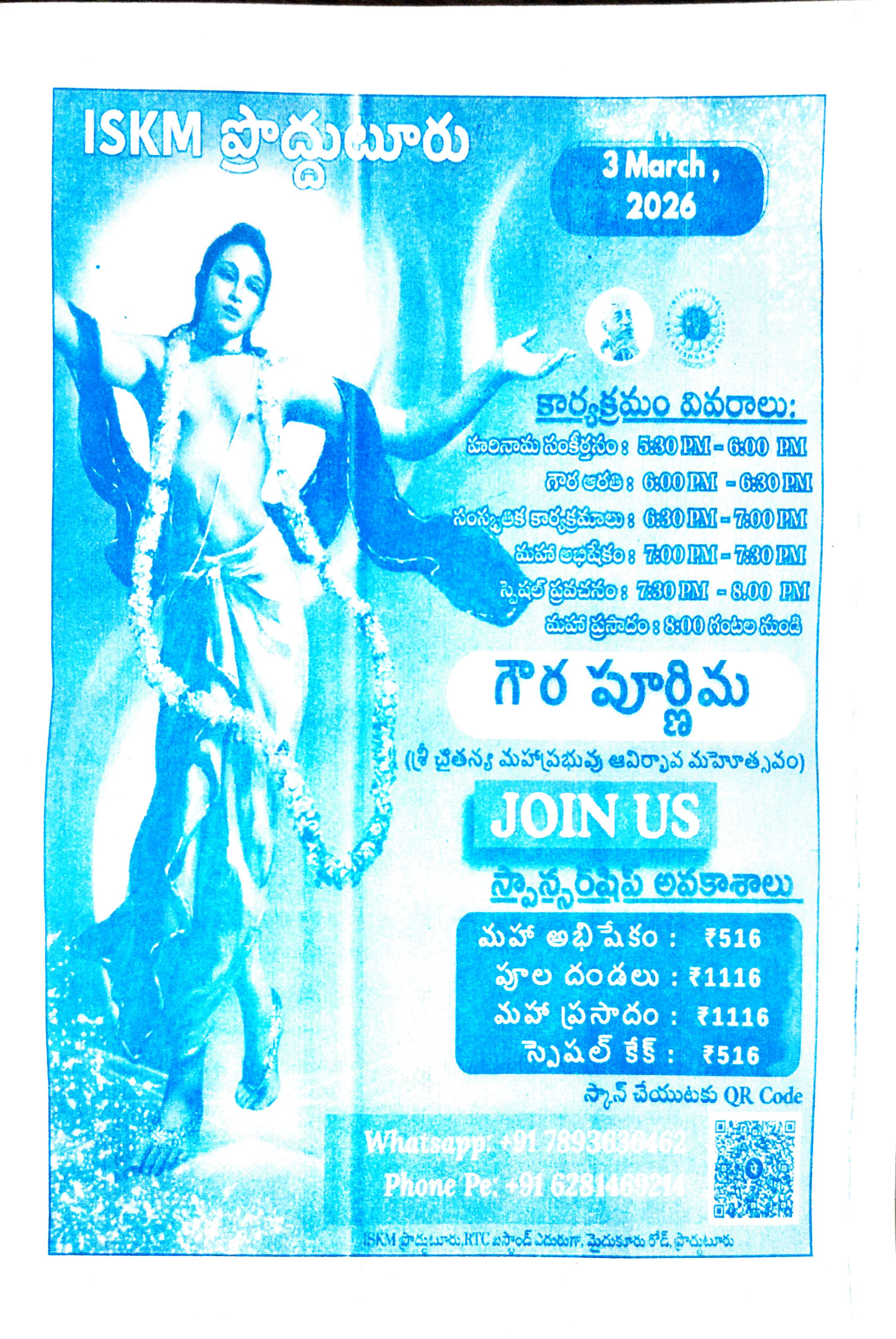 Join us at ISKM Proddatur for a soulful and blissful Gaura Purnima festival. Immerse yourself in the nectar of Harinama Sankirtanam, witness the grand Maha Abhishekam, and enjoy a delicious Maha Prasadam feast! #GauraPurnima2026 #SriChaitanyaMahaprabhu #ISKMProddatur #Proddatur #Kadapa #Naveen Kumar✨ Celebrate the Divine Appearance of Sri Chaitanya Mahaprabhu! ✨ Join us at ISKM Proddatur for a soulful and blissful Gaura Purnima festival. Immerse yourself in the nectar of Harinama Sankirtanam, witness the grand Maha Abhishekam, and enjoy a delicious Maha Prasadam feast! 🙏💛#GauraPurnima2026 #SriChaitanyaMahaprabhu #ISKMProddatur #Proddatur #Kadapa #Naveen Kumar0 Comments 0 Shares 421 Views 0 Reviews -