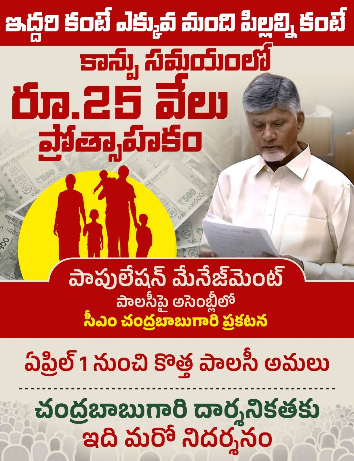 జనాభా నిర్వహణపై దృష్టి సారించక పొతే భవిష్యత్తులో చాలా సమస్యలు వస్తాయని సీఎం చంద్రబాబుగారు అన్నారు. జననాలు పెరగపోతే భవిష్యత్తులో పనిచేసేవారి సంఖ్య తగ్గిపోయి వృద్ధుల సంఖ్య పెరుగుతుందని అన్నారు. ఇద్దరి కంటే ఎక్కువ మంది పిల్లల్ని కంటే కాన్పు సమయంలోనే రూ.25 వేలు ఇస్తామని, ఈ నగదు పురస్కారం గేమ్ ఛేంజర్ కానుందని ఆయన అన్నారు.