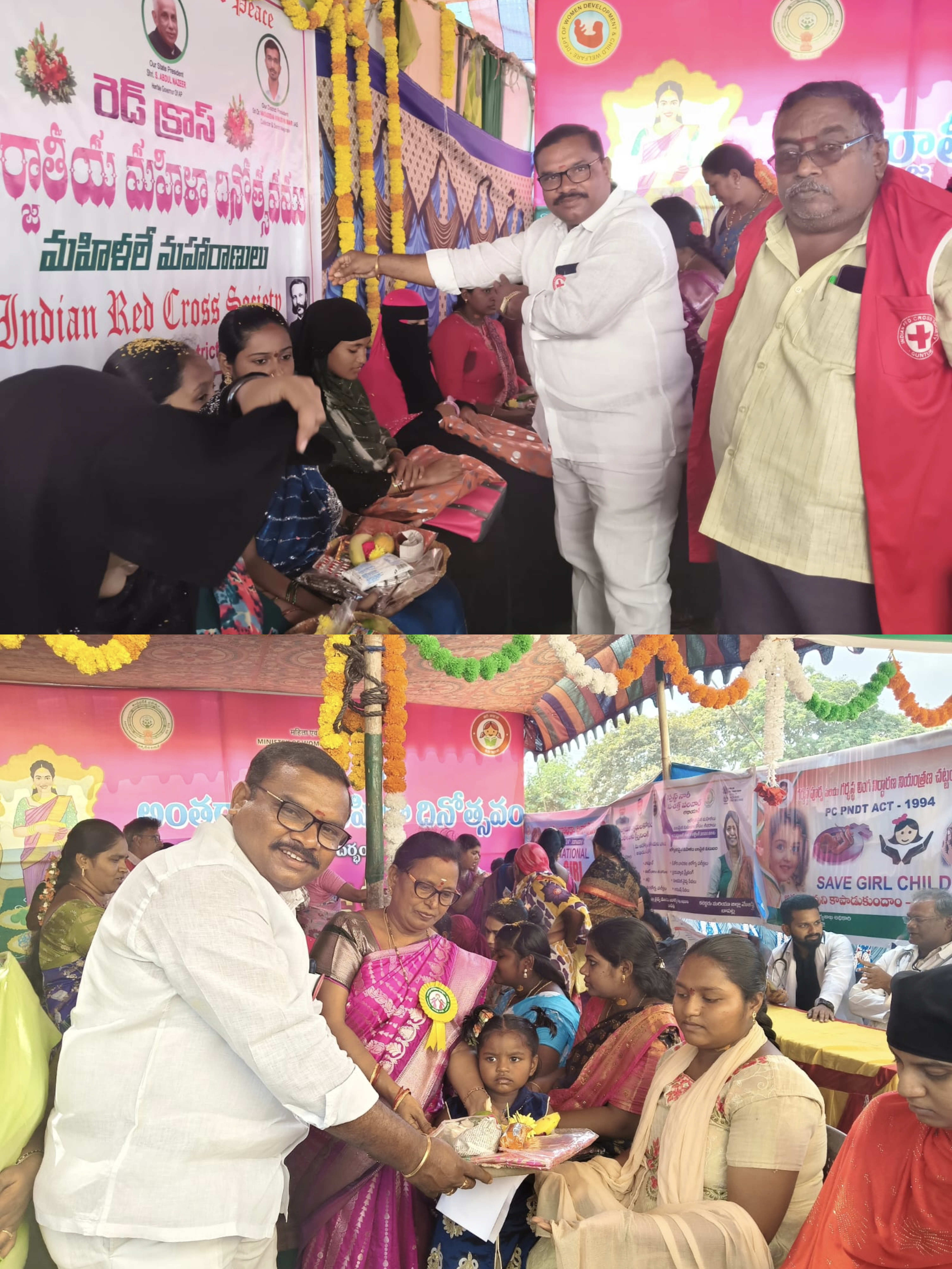 బాపట్ల జిల్లా బాపట్ల పట్టణం లోని మున్సిపల్ హై స్కూల్ ప్రాంగణంలో బాపట్ల జిల్లా కలెక్టర్ డాక్టర్ వి వినోద్ కుమార్, జిల్లా ఎస్పీ ఉమామహేశ్వర్ మరియు బాపట్ల శాసన సభ్యులు శ్రీ వేగేశన నరేంద్ర వర్మ ల సమక్షంలో అంగరంగ వైభోగంగా జరిగిన మహిళా దినోత్సవ వేడుకలలో పాల్గొని, బాపట్ల జిల్లా రెడ్ క్రాస్ సొసైటీ మరియు ఐసిడిఎస్ శాఖల ఆధ్వర్యంలో మహిళలకు నిర్వహించిన పలు కార్యక్రమాలలో భాగంగా గర్భిణులకు శ్రీమంతం మరియు మహిళామణులకు అభినందనల కార్యక్రమంలో పాల్గొని గర్భిణులకు శ్రీమంతపు కిట్లు అందజేసి ఆశీర్వదిస్తున్న బాపట్ల జిల్లా రెడ్ క్రాస్ సొసైటీ కార్యవర్గ సభ్యులు మరియు మాజీ సైనికుల రాష్ట్ర అధ్యక్షులు తాండ్ర సాంబశివరావు.