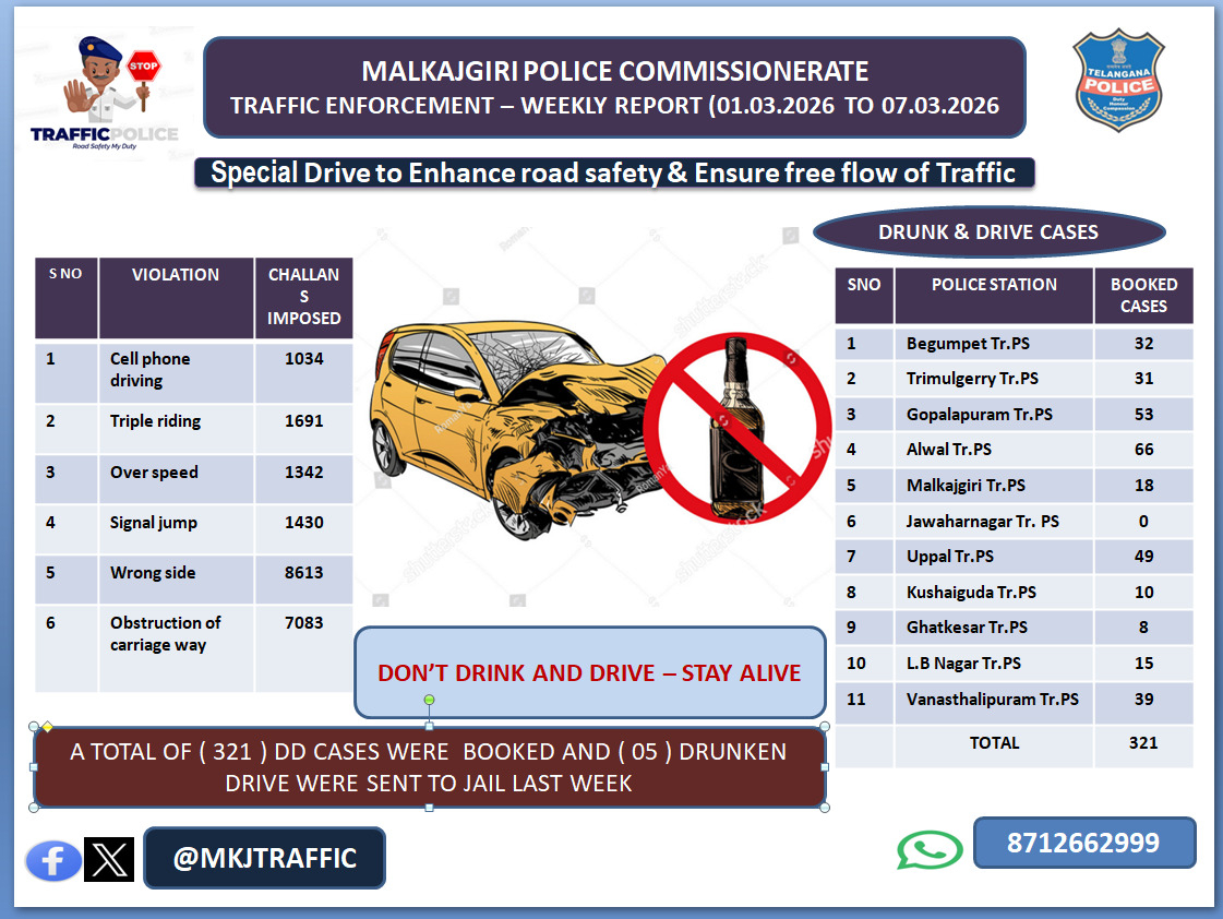 మల్కాజిగిరిలో డ్రంక్ అండ్ డ్రైవ్ తనిఖీలు: 321 మందిపై కేసులు. |