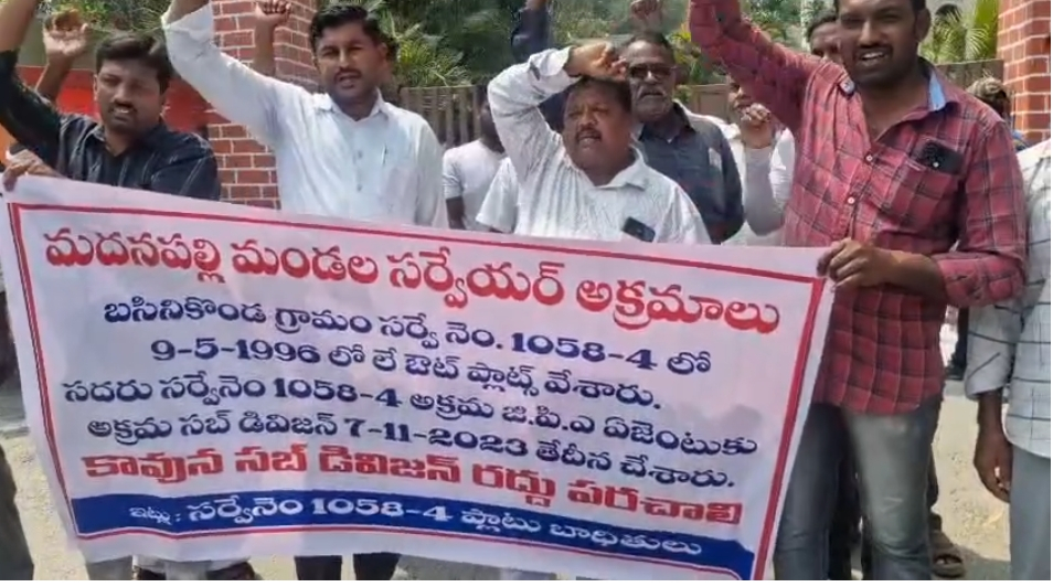 మదనపల్లి మండల సర్వేయర్ అక్రమాలకు పాల్పడుతున్నారని ఆరోపిస్తూ బాధితులు సోమవారం కలెక్టరేట్ ఎదుట నిరసన తెలిపారు. బసినికొండ సర్వే నంబర్ 1058/4లోని తమ ప్లాట్లను, నిబంధనలకు విరుద్ధంగా సబ్ డివిజన్ చేసి ఇతరులకు కట్టబెట్టారని శ్రీనివాసులు రెడ్డి, సహదేవ ఆరోపించారు. అన్యాయం చేసిన సర్వేయర్పై తక్షణమే కఠిన చర్యలు తీసుకోవాలని బాధితులు డిమాండ్ చేశారు.