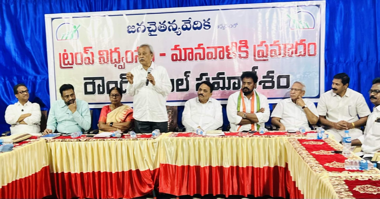 అమెరికా ప్రపంచ ఆధిపత్యాన్ని కొనసాగిస్తూ చమురు నిలవలున్న దేశాలను ఆక్రమించుకుని ప్రపంచ పోలీస్ గా వ్యవహరిస్తూ ఇరాన్, వెనిజుల లాంటి దేశాలపై చేస్తున్న దుర్మార్గపు దాడులను ప్రపంచ ప్రజలు ఐక్యంగా నిరసించి,నిలువరించాలని మాజీ శాసనసభ్యులు యం.ఏ.గఫూర్ పిలుపునిచ్చారు. ఈనెల 9వ తేదీన విజయవాడలోని దాసరి భవన్ లో జన చైతన్య వేదిక ఆధ్వర్యంలో ట్రంప్ విధ్వంసం - మానవాళికి ప్రమాదం అనే అంశంపై నిర్వహించిన రౌండ్ టేబుల్ సమావేశానికి జన చైతన్య వేదిక రాష్ట్ర అధ్యక్షులు వల్లంరెడ్డి లక్ష్మణరెడ్డి అధ్యక్షత వహించారు. మాజీ శాసనసభ్యులు యం.ఎ. గఫూర్ ప్రసంగిస్తూ ప్రపంచంలో అత్యధిక అప్పులు గల దేశంగా ఉంటున్న అమెరికా ఆర్థిక సంక్షోభాన్ని అధికమించడానికి అపారమైన చమురు నిల్వలున్న వెనుజుల, ఇరాన్ లాంటి సార్వభౌమ అధికారం గల దేశాలపై దాడులు చేస్తుందన్నారు. ఇరాన్ యుద్ధం ఫలితంగా చమురు, గ్యాస్ ధరలు పెరిగి ప్రపంచ వ్యాప్తంగా ద్రవ్యోల్బణం ఏర్పడే ప్రమాదం ఉందన్నారు. గల్ఫ్ దేశాలలో ఉన్న కోటి మంది భారతీయుల ఉనికి ప్రమాదంలో పడిందని, గల్ఫ్ దేశాలలో ఉన్న అమెరికా సైనిక స్థావరాలు తొలగిస్తేనే శాంతియుత వాతావరణం ఏర్పడుతుందన్నారు. విశ్వ గురువుగా ప్రకటించుకున్న భారత ప్రధాని నరేంద్ర మోడీ గాజ, వెనిజుల, ఇరాన్ లపై అమెరికా, ఇజ్రాయిల్ ల దాడులను ఖండించలేని నిస్సహాయ స్థితిలో ఉన్నారన్నారు.లిబరేషన్ కాంగ్రెస్ పార్టీ వ్యవస్థాపక అధ్యక్షులు మాజీ ఐఏఎస్ విజయ్ కుమార్ ప్రసంగిస్తూ విదేశాలతో సుహృద్భావ వాతావరణం కొనసాగించాలని, సఖ్యతను పెంపొందించుకోవాలని భారత రాజ్యాంగం ఆర్టికల్ 51 పేర్కొంటే నేటి కేంద్ర ప్రభుత్వం అందుకు విరుద్ధంగా వ్యవహరిస్తూ అమెరికా, ఇజ్రాయిల్ లకు కొమ్ము కాస్తుందన్నారు. గతంలో నాటి భారత ప్రధానులు అలీనఉద్యమానికి నాయకత్వం వహిస్తు చిన్నచిన్న దేశాలకు అండగా నిలిచారని, నేటి ప్రధాని నరేంద్ర మోడీ అనైతికత యుద్ధాలకు పాల్పడుతున్న దేశాలకు మద్దతు ఇవ్వడం శోచనీ యమన్నారు. జన చైతన్య వేదిక రాష్ట్ర అధ్యక్షులు వల్లంరెడ్డి లక్ష్మణరెడ్డి ప్రసంగిస్తూ అధికారం చేపట్టగానే 7 యుద్ధాలను ఆపానని, ప్రపంచశాంతి నోబెల్ బహుమతి తనకు ఇవ్వాలని పదేపదే కోరుతున్న ట్రంప్ అందుకు విరుద్ధంగా అనేక యుద్దాలకు శ్రీకారం చుట్టి మానవ వినాశకుడిగా మారారన్నారు. వెనిజులా చమరుపై ఆధిపత్యం పొందాలనే దురాశతో సార్వభౌమాధికారం గల వెనిజుల పై దండెత్తి ఆ దేశ అధ్యక్షుడిని గద్దలా ఎత్తుకు వెళ్లి అమెరికా జైలులో నిర్బంధించారన్నారు. అలాంటి ప్రయత్నంలో భాగంగా అన్వాయిదాలు రూపొందిస్తున్నారనే నెపంతో ఆ దేశ అధ్యక్షుడు అయతుల్లా సయ్యద్ అలీ హుస్సేన్ ఖమేని తో పాటు 50 మంది ముఖ్య నేతలను ఇజ్రాయిల్ తో కలిసి హతమార్చారని తెలిపారు. డో