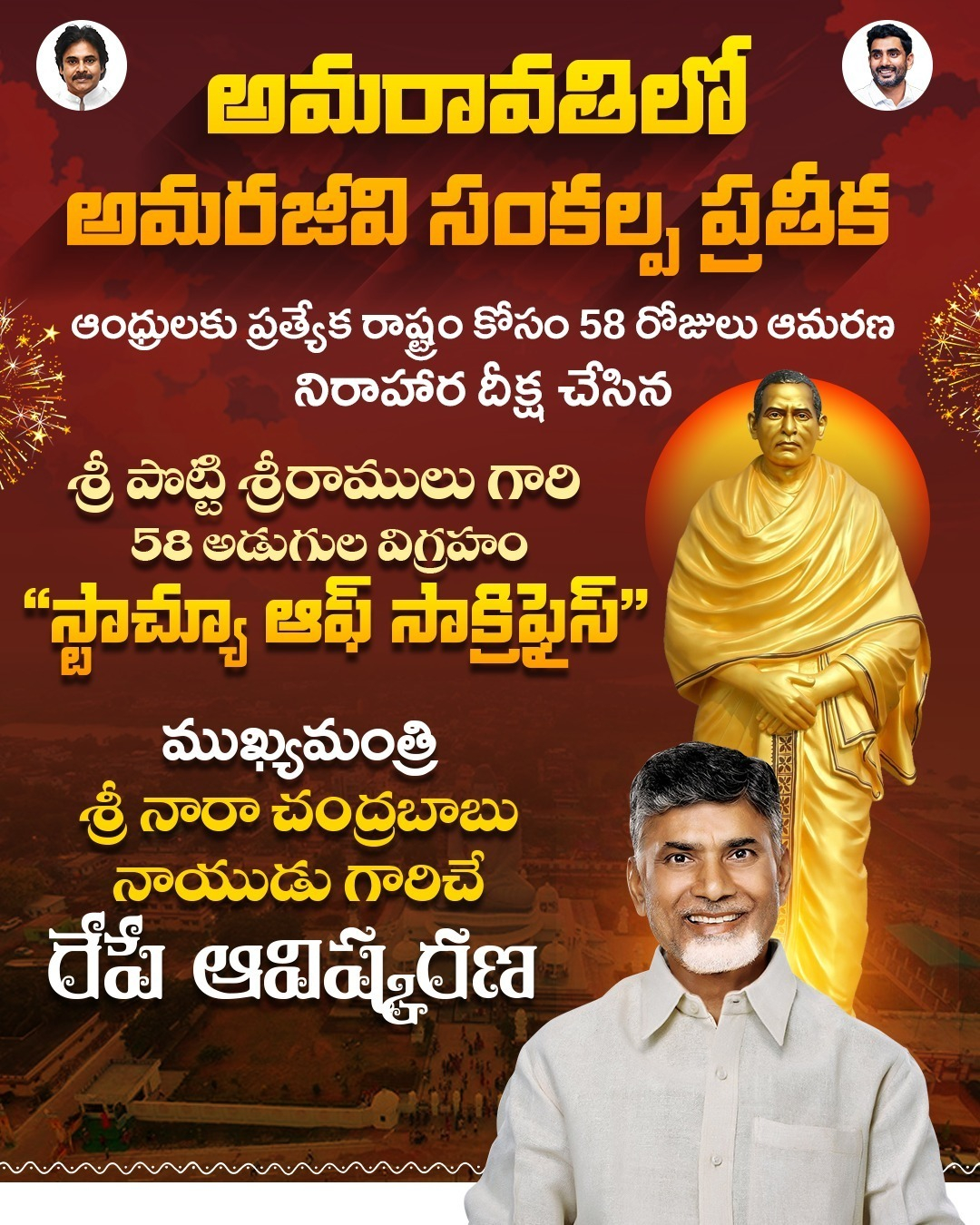 దేశ విదేశాల్లో ఉన్న తెలుగు వారందరూ కలిసి స్థాపించిన 'అమరజీవి పొట్టి శ్రీరాములు మెమోరియల్ ట్రస్ట్' ఆధ్వర్యంలో... ముఖ్యమంత్రి చంద్రబాబు గారి సంకల్పంతో అమరావతిలోని శాఖమూరులో 6.8 ఎకరాల విస్తీర్ణంలో ఏర్పాటు చేసిన స్మృతి వనం. అందులో 58 అడుగుల శ్రీ పొట్టి శ్రీరాములు గారి విగ్రహాన్ని రేపు ముఖ్యమంత్రి, ఉప ముఖ్యమంత్రి, మంత్రి లోకేష్ గార్లు ప్రారంభించనున్నారు.