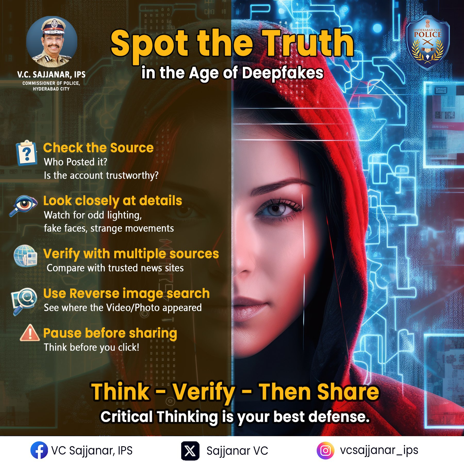 డీప్ఫేక్ వీడియోలు లేదా ఫొటోలను నిశితంగా గమనిస్తే లైటింగ్లో తేడాలు, ముఖ కవళికల్లో సహజత్వం లేకపోవడం, కదలికల్లో అసహజత్వం వంటి లక్షణాల ద్వారా అవి నకిలీ అని గుర్తించవచ్చని సీపీ సజ్జనర్ పేర్కొన్నారు.