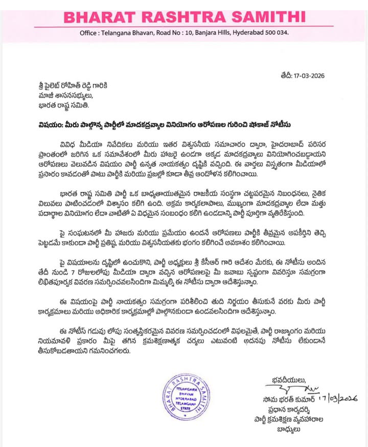 బీఆర్ఎస్ చీఫ్, మాజీ సీఎం కేసీఆర్ సంచలన నిర్ణయం తీసుకున్నారు. మాజీ ఎమ్మెల్యే పైలట్ రోహిత్ రెడ్డి వ్యవహారంపై కేసీఆర్ తీవ్ర ఆగ్రహం వ్యక్తం చేశారు. మాదక ద్రవ్యాల వినియోగం ఆరోపణలపై ఆయనకు షోకాజ్ నోటీసు జారీ చేశారు. వారం రోజుల్లోగా మీడియా ద్వారా వచ్చిన ఆరోపణలపై స్పష్టంగా లిఖితపూర్వక వివరణ ఇవ్వాలని ఆదేశాలు జారీ చేశారు. షోకాజ్ నోటీసుకు గడువులోపు వివరణ సమర్పించడంలో విఫలమైతే పార్టీ నియమావళి ప్రకారం వేటు వేసేందుకు కూడా వెనుకాడబోమని లేఖలో హెచ్చరికలు పంపారు. పార్టీ క్రమశిక్షణను ఉల్లంఘించే వారు ఎంతటి వారైనా సరే ఉపేక్షించేది లేదని, ప్రజల్లో పార్టీ ప్రతిష్టను దెబ్బతీసే చర్యలను సహించబోమని ఈ సందర్భంగా అధిష్టానం స్పష్టమైన సంకేతాలు పంపింది.