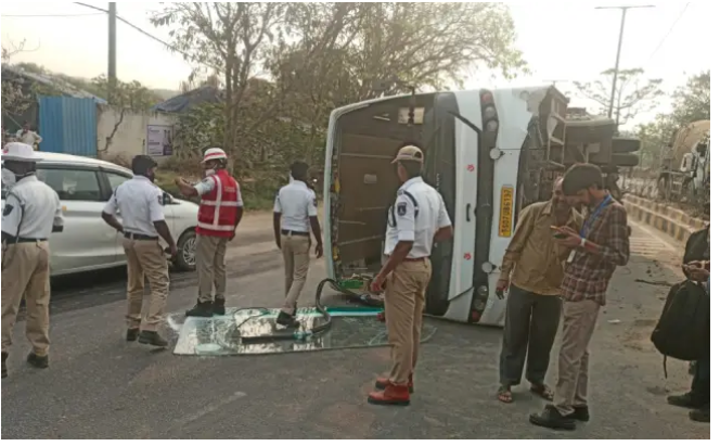 బాచుపల్లిలో ఫార్మా బస్సు బోల్తా 10 మందికి గాయాలు