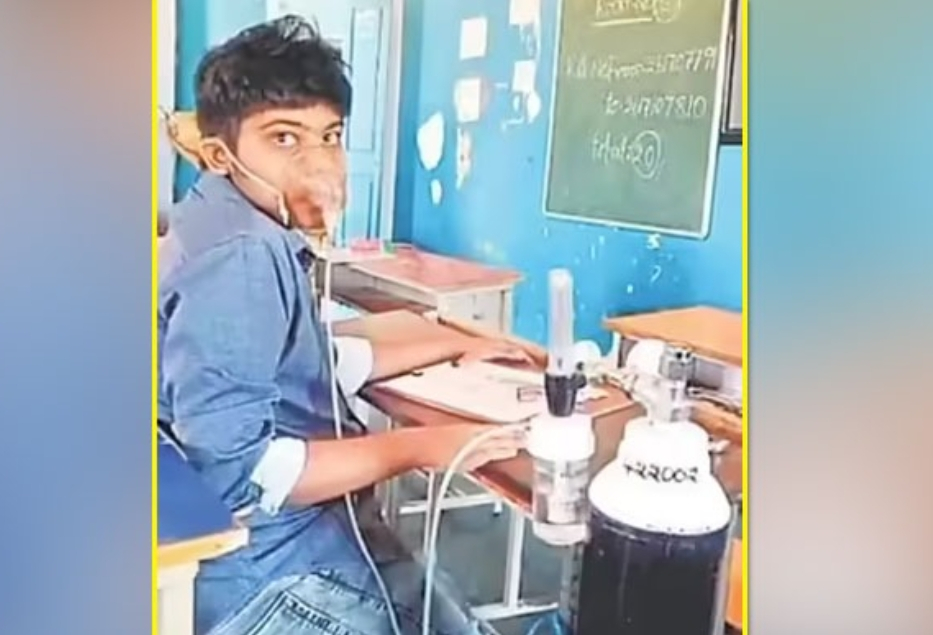 ఆక్సిజన్ సిలిండర్‌తో పరీక్ష రాసిన విద్యార్థి