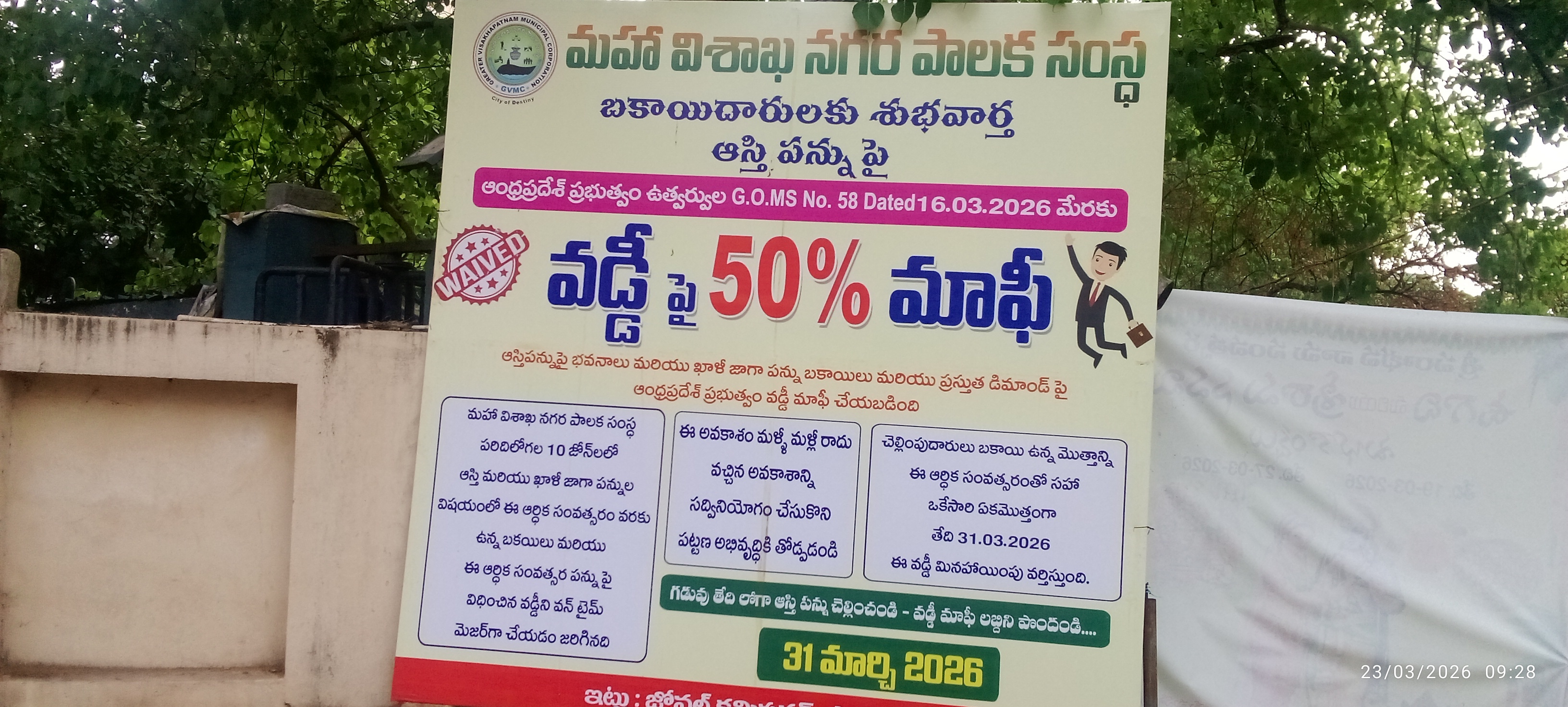 గ్రేటర్ విశాఖ మహా నగర పాలక సంస్థ కమిషనర్ వారు విశాఖ కార్పొరేటు పరిధి లో ఓ శుభ వార్త చెప్పారు . ఈనెల మార్చి31 లోపల మహా నగరపరిధి లో ఉన్న జాగా లకు . ప్లాట్లకు. కట్టవలసిన మొండి బకాయి లకు వడ్డీకి 50 శాతం మాఫీ చేస్తున్నామని నగర పాలక సంస్థ అధికార వర్గాలు తెలిపాయి. వన్ టైమ్ సెటాల్మెంట్ మెంబర్ గా తీసు కుంటున్నా మని ప్రజలు గమనించి స్వర్ణ విశాఖ పట్టణ అభి వృద్ధి కి తోడ్పడాలని . ఈ నెల 31 వరకే వర్తిస్తుo ద న్నారు. నగర పాలక సంస్థ కార్యాల యం నకు సంప్రదించి బకాయిలు చెల్లించి రసీదు తీసుకోవాలన్నారు