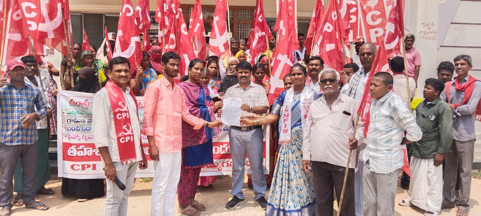 *చంద్రబాబు ఎన్నికల ఇచ్చిన హామీ ప్రకారంగా అర్హులైన నిరుపేదలకు పట్టణాల్లో 2 సెంట్లు,గ్రామీణ ప్రాంతాలలో 3 సెంట్లు ఇంటి స్థలాలను ఇచ్చి,ఇంటి నిర్మాణానికి 5 లక్షల రూపాయలు కూటమి ప్రభుత్వమే మంజూరు చేయాలి,టిడ్కో గృహాలను లబ్ధిదారులకు అప్పజెప్పాలని కోరుతూ ఎమ్మిగనూరు CPI ఆధ్వర్యంలో MRO కార్యాలయం ముందు ధర్నా...MRO కి వినతి: సిపిఐ*