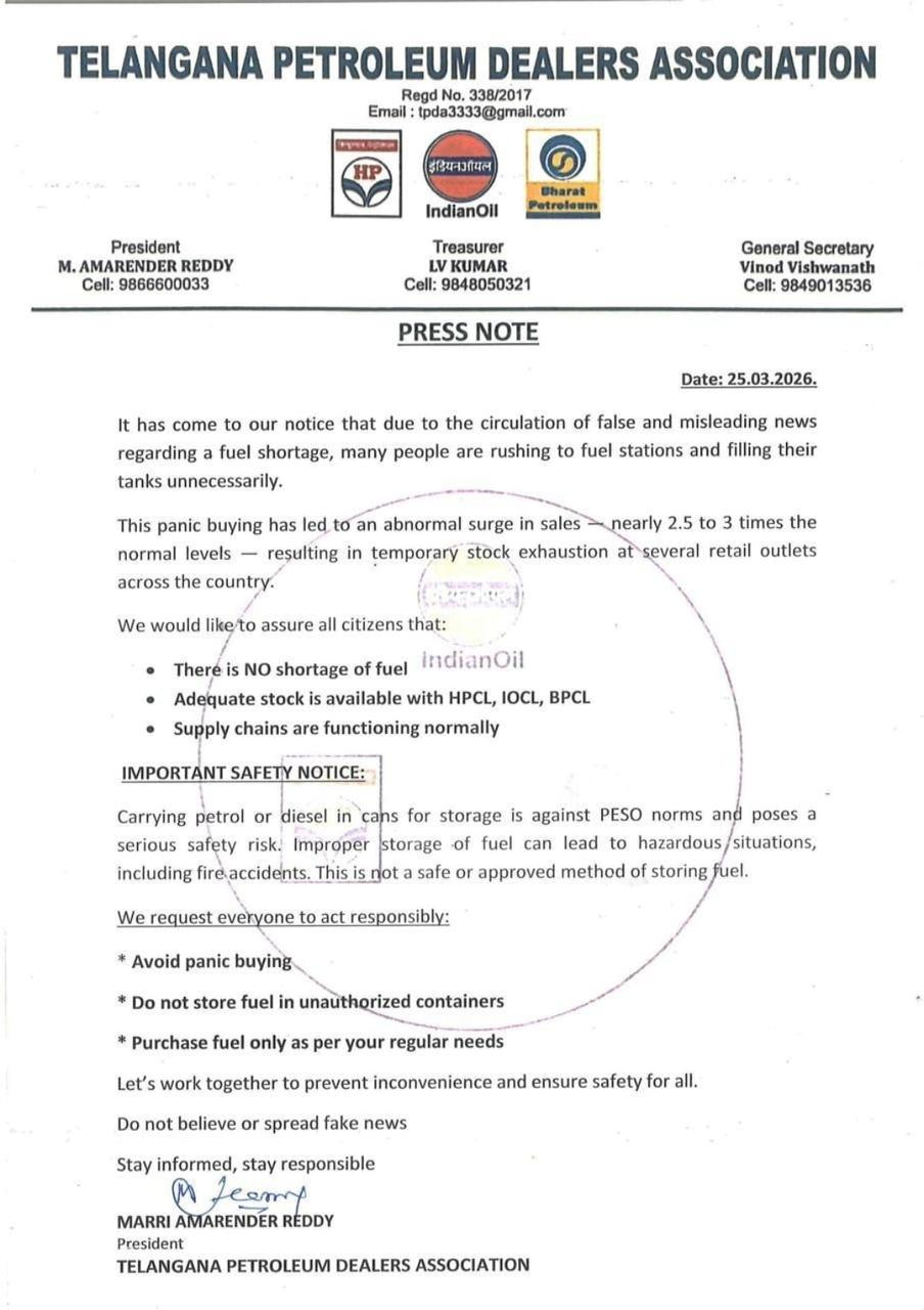 ఇటీవలి రోజుల్లో సోషల్ మీడియాలో పెట్రోల్ కొరతపై వస్తున్న వార్తలు పూర్తిగా అసత్యం. అధికారిక వర్గాల ప్రకారం రాష్ట్రంలో ఎక్కడా పెట్రోల్ సరఫరా లోపం లేదు. కొన్ని తప్పుడు ప్రచారాలు ప్రజల్లో భయాందోళన కలిగిస్తున్నాయి. ఆయిల్ కంపెనీలు సాధారణంగా సరఫరా కొనసాగిస్తున్నాయని స్పష్టం చేశాయి. ప్రజలు ఈ రకాల వదంతులను నమ్మకుండా, అవసరానికి మించి ఇంధనం నిల్వ చేయకుండా సహకరించాలి. తప్పుడు వార్తలను పంచేవారిపై చట్టపరమైన చర్యలు తీసుకుంటామని అధికారులు హెచ్చరించారు. నిజమైన సమాచారానికి మాత్రమే ప్రాధాన్యం ఇవ్వాలి