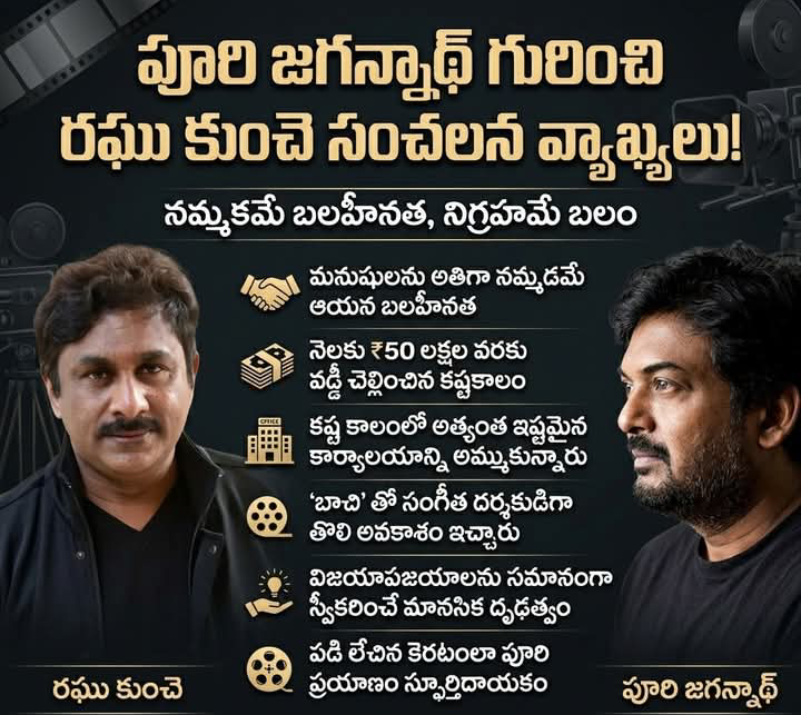 ‎రఘు కుంచె, పూరి జగన్నాథ్ గారితో తనకున్న రిలేషన్ గురించి ఇటీవల ఒక ఇంటర్వ్యూలో మనసు విప్పి మాట్లాడారు. పని అడగకపోయినా తన ప్రతిభను గుర్తించి 'బాచి'తో తొలి అవకాశం ఇచ్చి, ఆ తర్వాత 'ఇడియట్', 'అమ్మ నాన్న ఓ తమిళ అమ్మాయి' వంటి హిట్లతో సింగర్‌గా కూడా నిలబెట్టినందుకు కృతజ్ఞతలు తెలిపారు. 🤝