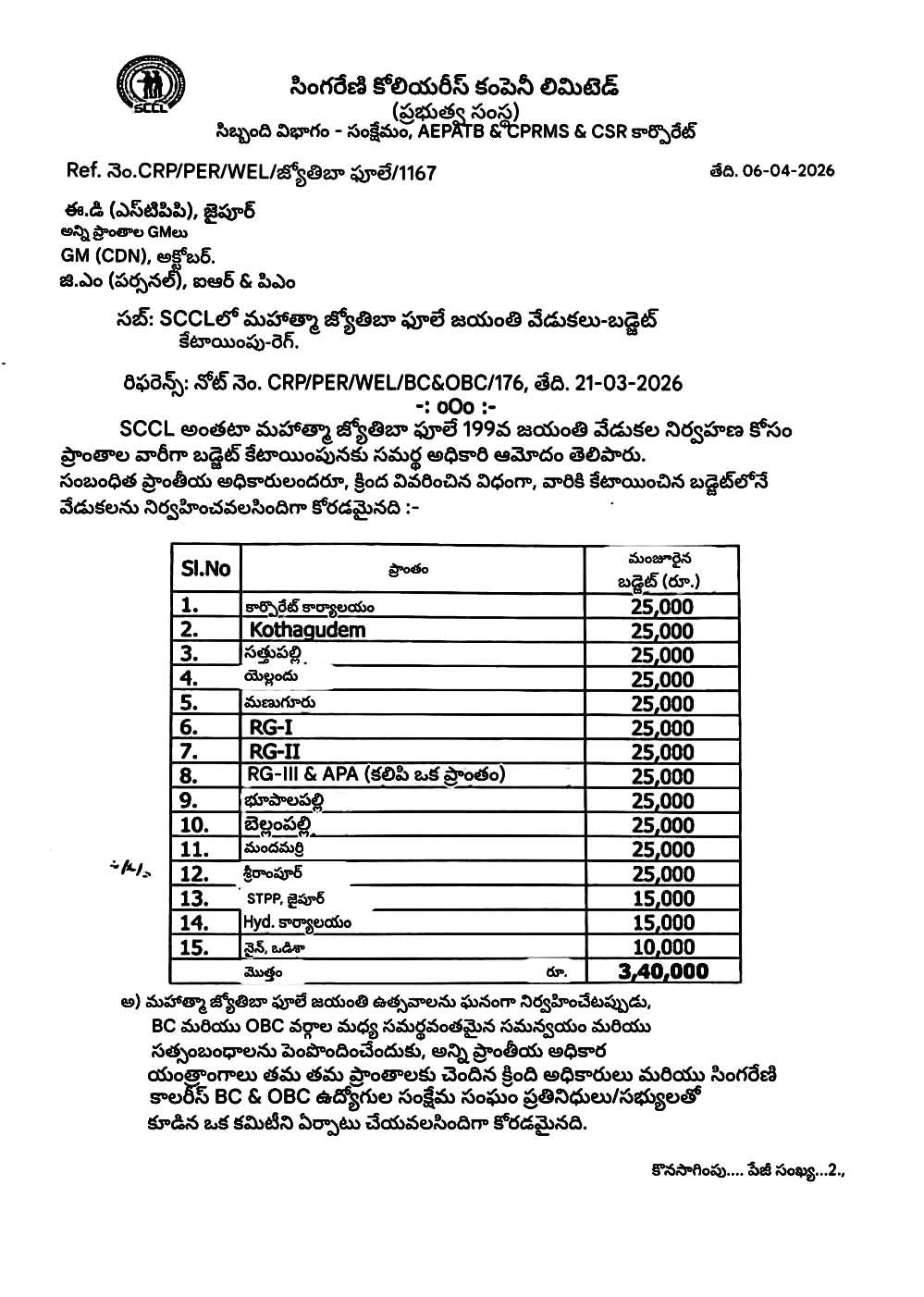 మంచిర్యాల : సింగరేణి కాలరీస్ కంపెనీ అన్ని ఏరియాలో మహాత్మా జ్యోతిబా ఫూలే 199వ జయంతి వేడుకల నిర్వహణ కోసం ప్రాంతాల వారీగా బడ్జెట్ కేటాయింపునకు అధికారిక ఆమోదం తెలిపారు,సంబంధిత ప్రాంతీయ అధికారులందరూ, క్రింద వివరించిన విధంగా, వారికి కేటాయించిన బడ్జెట్లోనే వేడుకలను నిర్వహించవలసిందిగా ఆదేశాలు జారీ చేసారు,