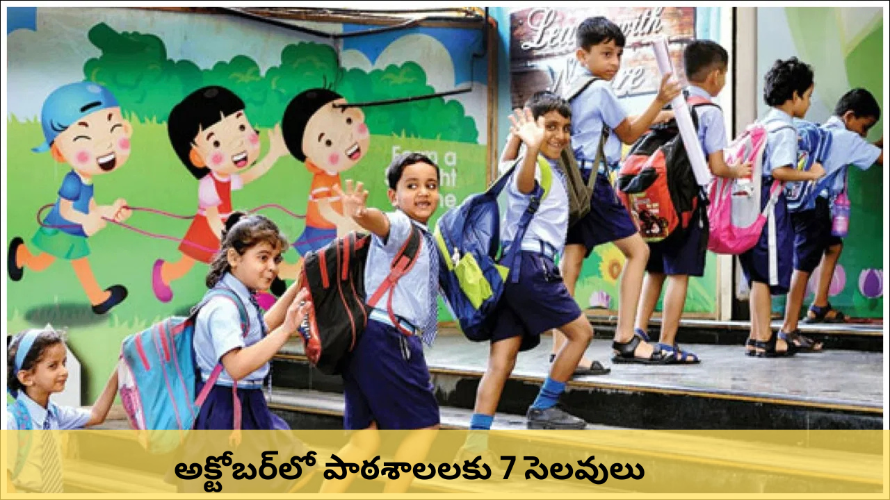 ఆంధ్రప్రదేశ్లో అక్టోబర్ నెలలో పాఠశాలలకు మొత్తం 7 సెలవులు ప్రకటించారు. గాంధీ జయంతి, విజయదశమి, దీపావళి వంటి పండుగలతో పాటు, రెండవ శనివారం మరియు ఆదివారాలు ఈ సెలవుల్లో భాగంగా ఉన్నాయి.