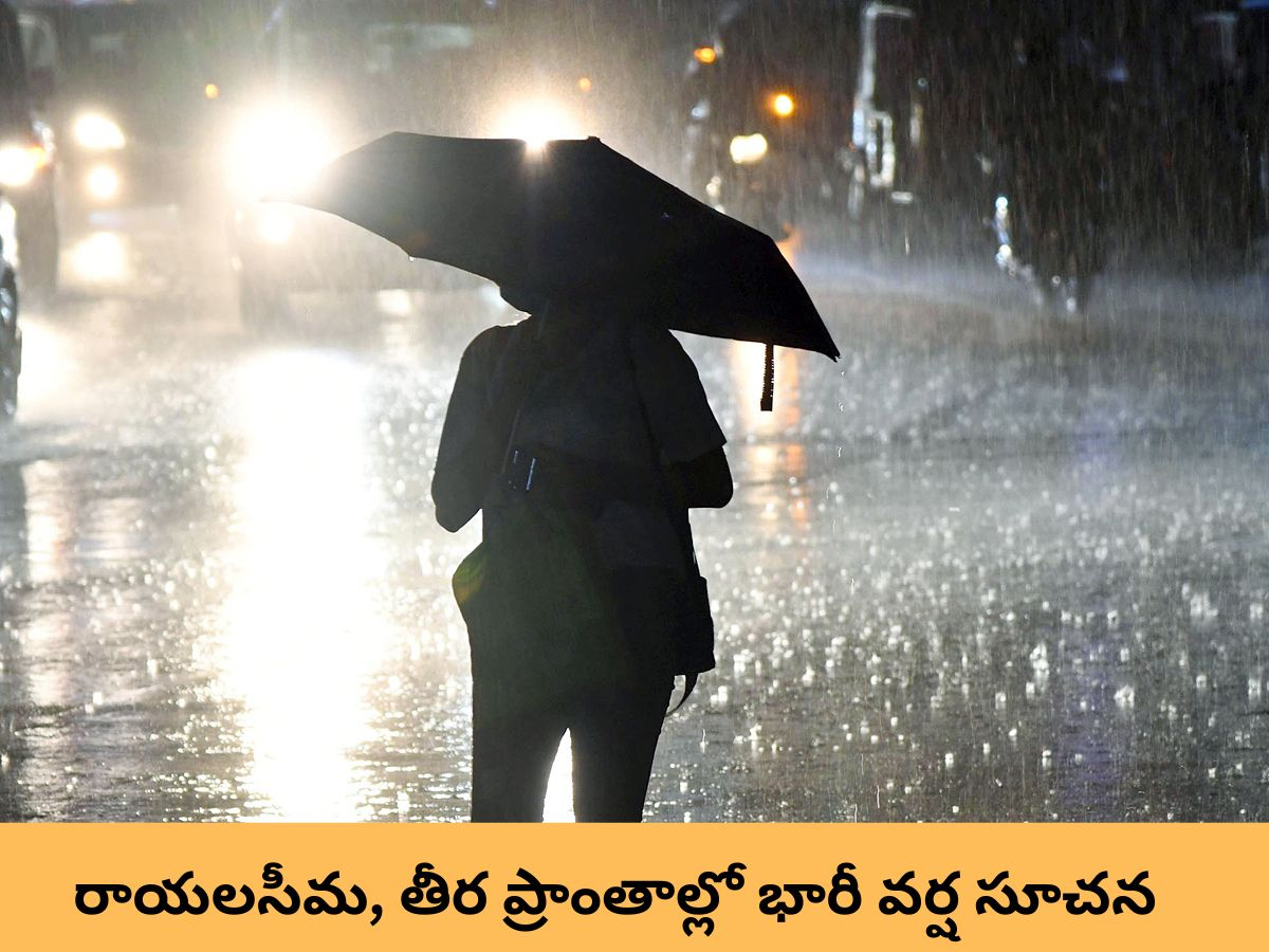 ఆంధ్రప్రదేశ్లోని తీర ప్రాంతాలు మరియు రాయలసీమ జిల్లాల్లో వచ్చే 24 గంటల్లో భారీ వర్షాలు కురిసే అవకాశం ఉందని భారత వాతావరణ శాఖ హెచ్చరించింది.