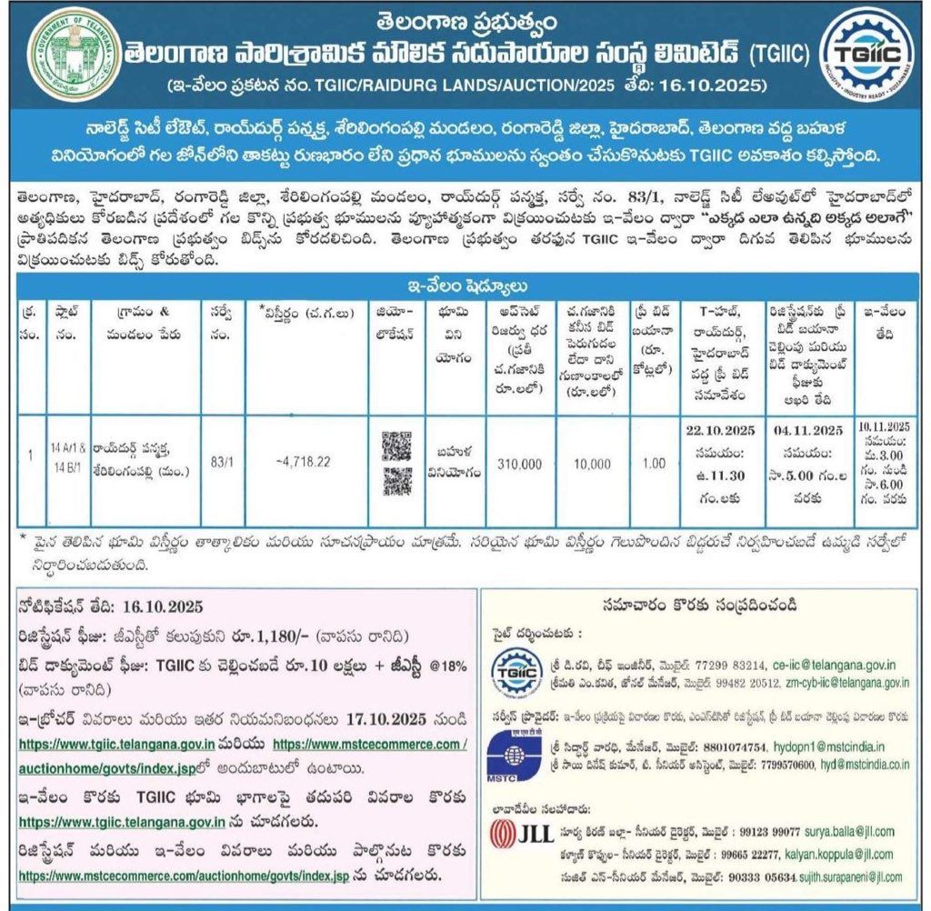ఒక్క గజానికి రూ.3,10,000 రిజర్వ్ ధర నిర్ధారిస్తూ టీజీఐఐసీ నోటిఫికేషన్.