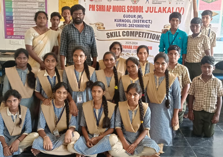 జూలకల్లు విలేజ్ గూడూరు మండలం కర్నూల్ డిస్టిక్ సమగ్ర శిక్ష ఆదేశానుసారం పాఠశాల ఒకేషనల్ విద్య ఆధ్వర్యంలో , ఐ టి-ఐ టి ఈ యస్ బ్యూటీ & వెల్నెస్ కోర్సులో స్కిల్ కాంపిటీషన్స్ నిర్వహించడమైనది. ఈ స్కిల్ కాంపిటీషన్స్ కు 9వ మరియు 12వ తరగతి వరకు విద్యార్థులు పాల్గొని తమ యొక్క నైపుణ్యాలను ప్రదర్శించడం జరిగింది. ఈ నైపుణ్య పోటీలకు ముఖ్య అతిథిగా ప్రిన్సిపాల్ హెచ్ దిల్షాద్ హాజరై విద్యార్థులు తయారు చేసినటువంటి వివిధ రకాల ప్రాజెక్టులను పరిశీలించి తగు సూచనలు ఇవ్వడం జరిగింది. ప్రిన్సిపాల్ మాట్లాడుతూ ఈ పోటీలలో గెలుపొందిన విద్యార్థులు ఈనెల 7వ తేదీన జిల్లా స్థాయిలో తమ ప్రదర్శనలను ప్రదర్శించి అక్కడ గెలుపొందిన వారు రాష్ట్ర స్థాయిలో ప్రదర్శించడానికి వెళ్తారని తెలియజేశారు. ఈ పోటీల్లో పాల్గొన్న విద్యార్థులు అందరినీ అభినందించడం జరిగింది.. ఈ కార్యక్రమానికి జడ్జ్ గా స్కూలు ప్రిన్సిపాల్ హెచ్ దిల్షాద్ హాజరై విద్యార్థులు ప్రదర్శించడం వంటి ప్రదర్శనలు పరిశీలించి ఉత్తమ ప్రాజెక్టులను ఎంపిక చేయడం జరిగింది. ఈ కార్యక్రమం మొత్తాన్ని స్కూల్ ఒకేషనల్ ఉపాధ్యాయులు పి హర్షద్ మరియు ఎం మంజుల పర్యవేక్షించారు.