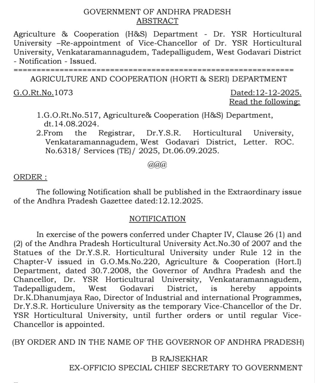 తాడేపల్లిగూడెం డా. వైఎస్ఆర్ ఉద్యాన విశ్వవిద్యాలయానికి తాత్కాలిక వైస్ - ఛాన్సలర్ గా డా. కె. ధనుంజయ రావు నియమితులయ్యారు. రెగ్యులర్ వైస్-చాన్సలర్ నియామకం వరకు డా.కె.ధనుంజయ రావు విశ్వవిద్యాలయానికి వీసీగా బాధ్యతలు నిర్వర్తిస్తారు.