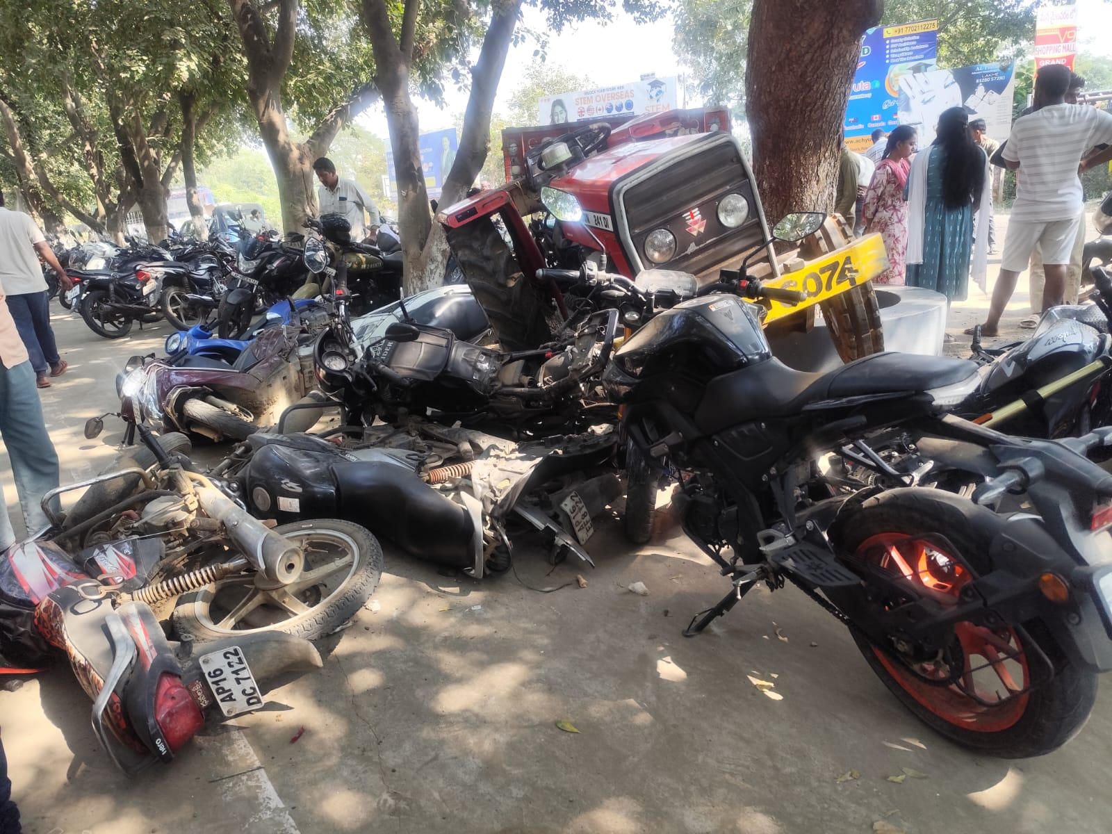 స్టూడెంట్స్ పార్క్ చేసిన మోటర్ సైకిల్ ల పైకి దూసుకెళ్లిన ట్రాక్టర్