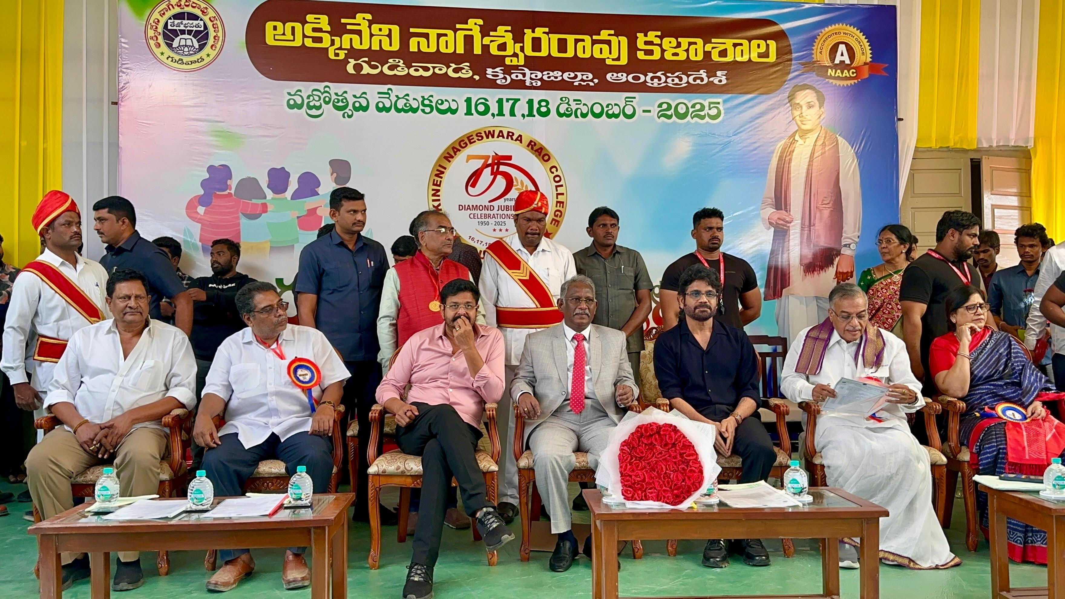 గుడివాడ ఏఎన్ఆర్ కళాశాల వజ్రోత్సవ వేడుకలు ఘనంగా జరుగుతున్నాయి. రెండో రోజు వేడుకల్లో సినీ హీరో అక్కినేని నాగార్జున, హైకోర్టు జస్టిస్ బట్టు దేవానంద్, గుడివాడ, పామర్రు ఎమ్మెల్యేలు వెనిగండ్ల రాము, వర్ల కుమార్ రాజాలు ముఖ్యఅతిథిలుగా పాల్గొన్నారు. ముందుగా నాగార్జున సభా వేదిక మీదకు చేరుకోగానే అభిమానులు, విద్యార్థులు కేరింతలు కొడుతూ సందడి చేశారు.