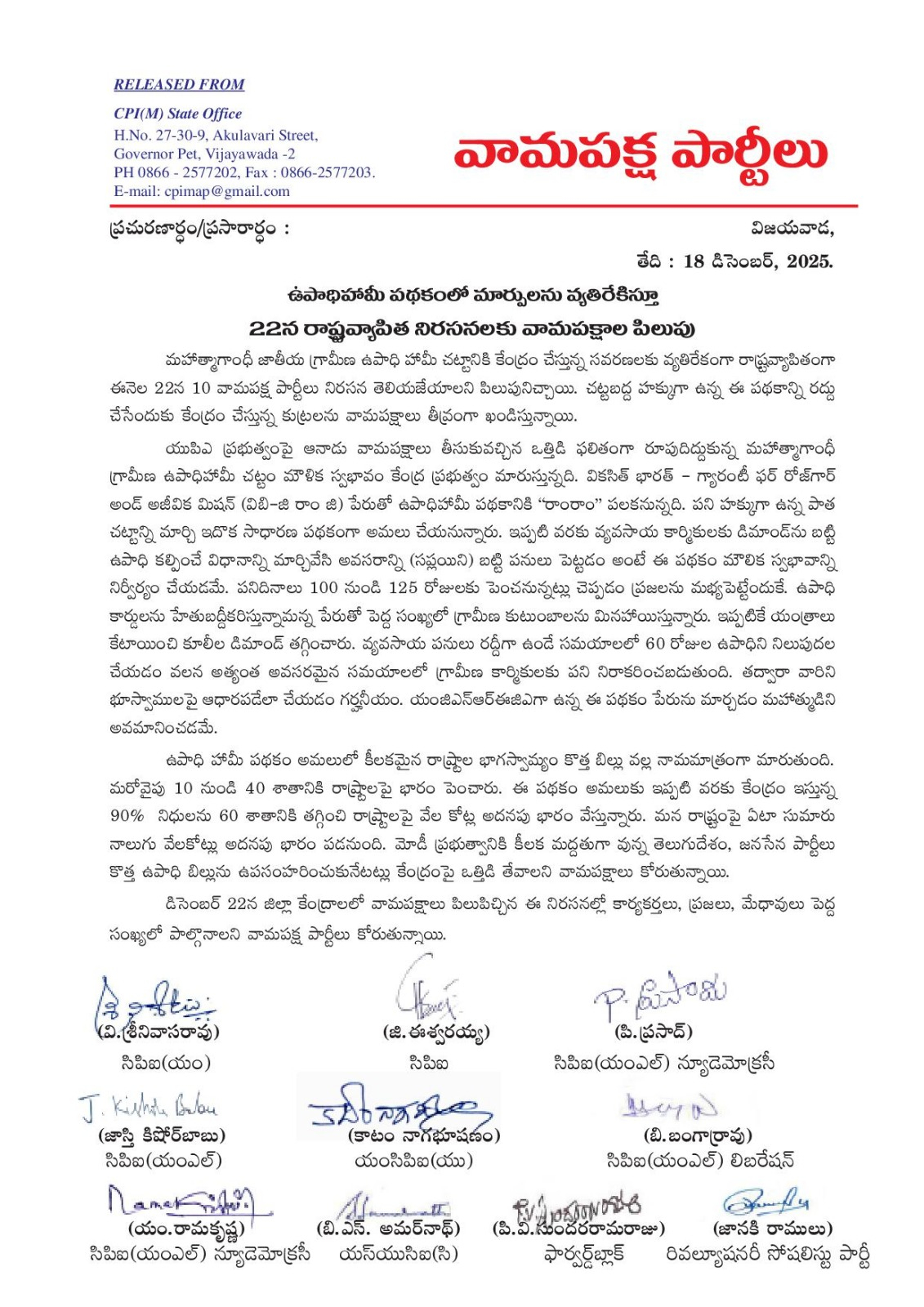మహాత్మాగాంధీ జాతీయ గ్రామీణ ఉపాధి హామీ చట్టానికి కేంద్రం చేస్తున్న సవరణలకు వ్యతిరేకంగా రాష్ట్రవ్యాపితంగా ఈనెల 22న 10 వామపక్ష పార్టీలు నిరసన తెలియజేయాలని పిలుపునిచ్చాయి. చట్టబద్ద హక్కుగా ఉన్న ఈ పథకాన్ని రద్దు చేసేందుకు కేంద్రం చేస్తున్న కుట్రలను వామపక్షాలు తీవ్రంగా ఖండిస్తున్నాయి.