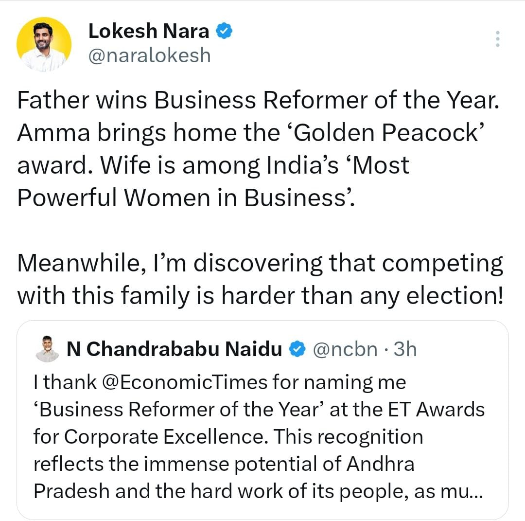 తన కుటుంబ సభ్యులకు అవార్డులు రావడంపై లోకేష్ ట్వీట్