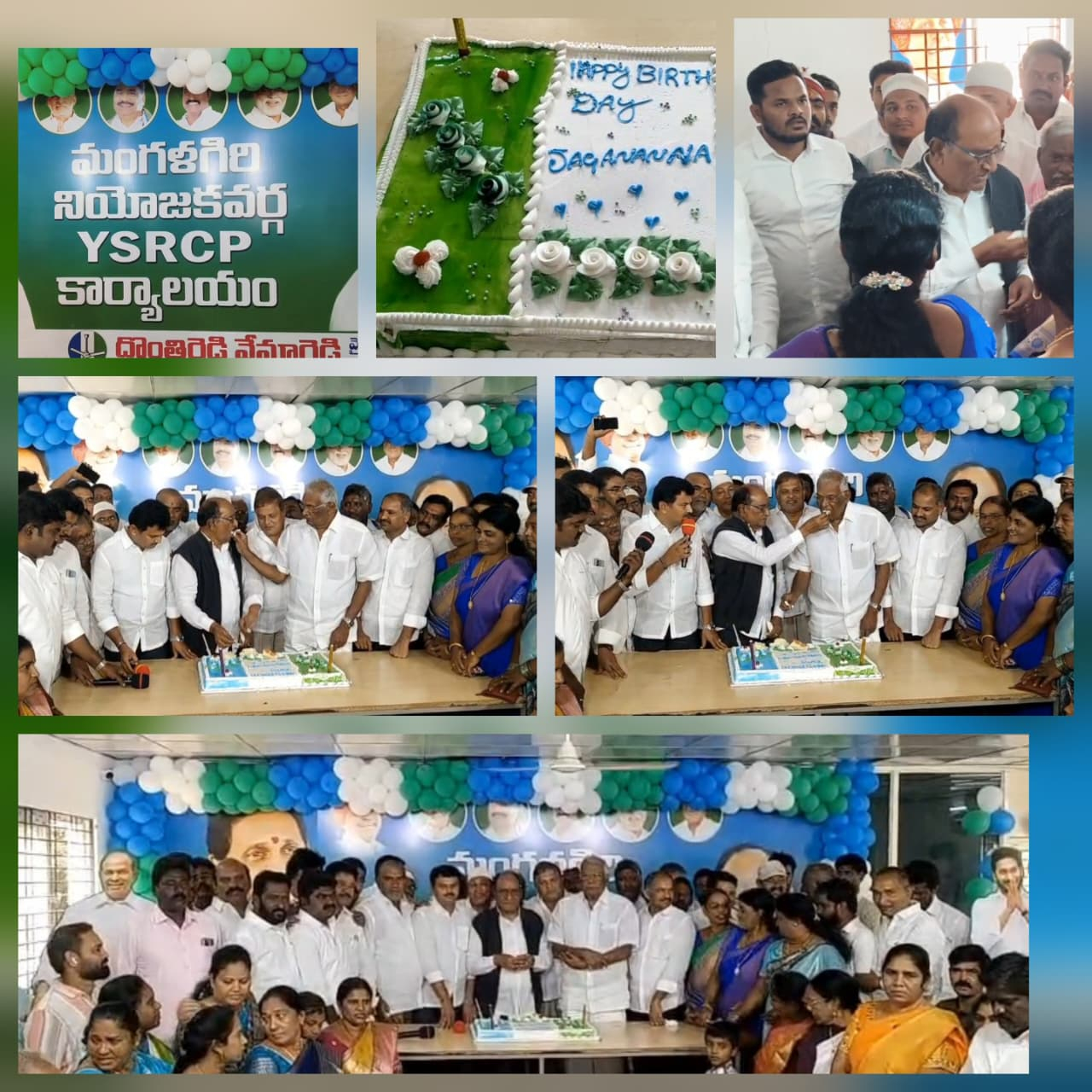 మాజీ ముఖ్యమంత్రి వైఎస్ జగన్మోహన్ రెడ్డి జన్మదిన సందర్భంగా గుంటూరు జిల్లా మంగళగిరి నియోజకవర్గం వైఎస్ఆర్ కాంగ్రెస్ పార్టీ కార్యక్రమంలో సమన్వయకర్త దొంతిరెడ్డి వేమారెడ్డి ఎమ్మెల్సీ మురుగుడు హనుమంతరావు మాజీ ఆప్కో చైర్మన్ చిల్లపల్లి మోహన్ ఆధ్వర్యంలో వేడుకలు ఘనంగా నిర్వహించారు.