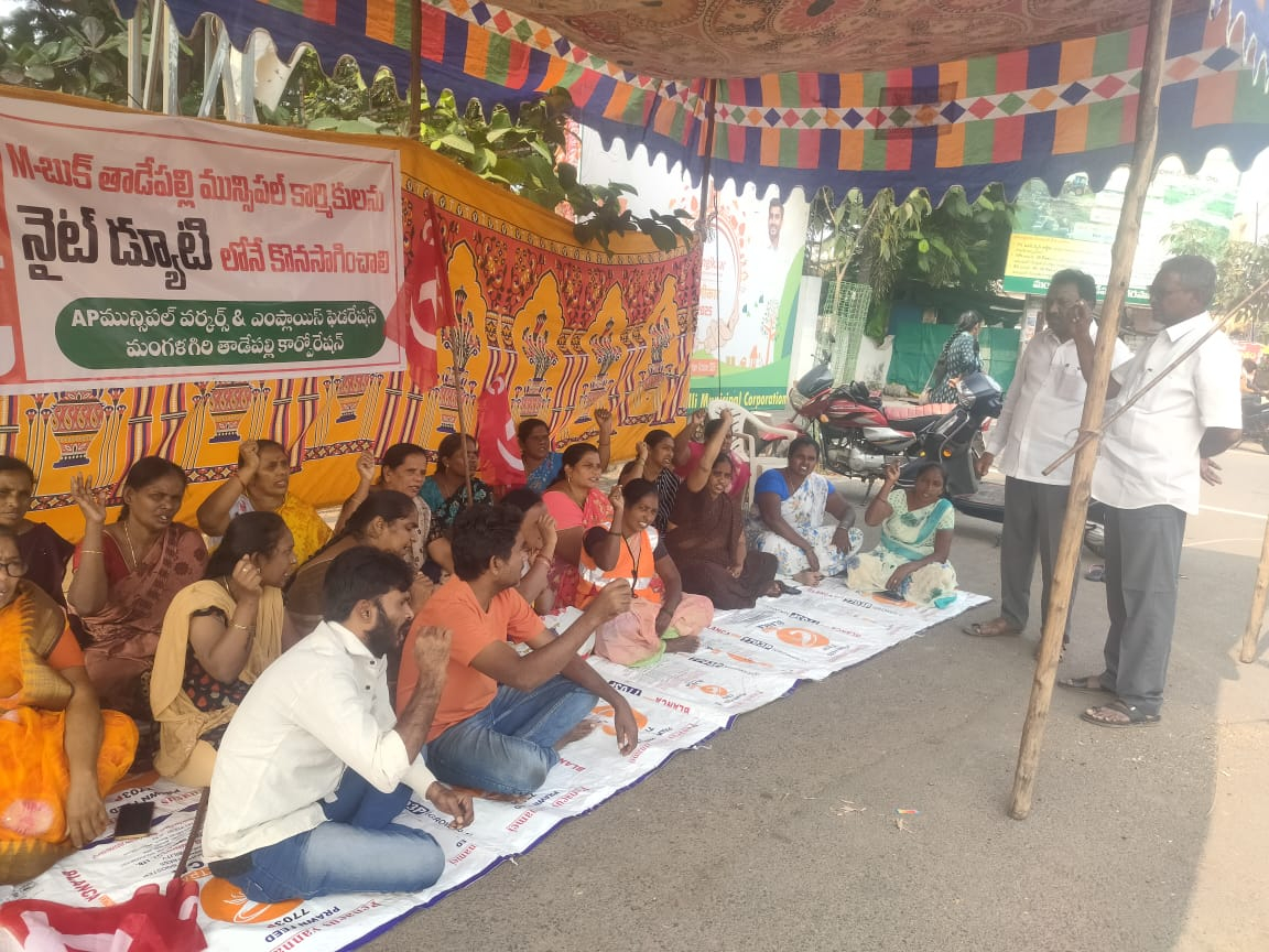 తాడేపల్లి లోని ఎం బుక్ కార్మికులను పగలు డ్యూటీలకు రావాలని కాంట్రాక్టర్ల ఒత్తిడి మేరకు కార్మికులను నైట్ షిఫ్ట్ తీసుకోకుండా ఉన్నందున కార్మికులకు నైట్ డ్యూటీలు కేటాయించాలని కోరుతూ గత మూడు రోజులుగా మంగళగిరిలోని మున్సిపల్ కార్పొరేషన్ కార్యాలయం ముందు నిరసన కార్యక్రమాలు కొనసాగిస్తున్నారు నేటికీ మూడవ రోజుకు దీక్షను మున్సిపల్ యూనియన్ జిల్లా కార్యదర్శి చెంగయ్య బుర్ర వెంకటేశ్వర్లు ప్రారంభించి వారు మాట్లాడినారు జంగయ్య మాట్లాడుతూ కార్మికులను ఏ విధమైన ఒప్పందంతో గత నాలుగేళ్ల క్రితం డ్యూటీకి తీసుకున్నారు ఆ ఒప్పందమెరకు కార్మికులకు నైట్ షిఫ్ట్ పనిని కేటాయించాలని డిమాండ్ చేశారు ఈ కార్యక్రమంలో సిఐటియు నాయకులు బోరుగ వెంకటేశ్వర్లు జయమ్మ కనకదుర్గ పార్వతి వాసంతి కుమారి కనక తదితరులు పాల్గొన్నారు బోర్ గా వెంకటేశ్వర్లు మాట్లాడుతూ కార్మికులను పనుల్లోకి తీసుకోకుంటే పోరాటాన్ని మరింత చేస్తామని హెచ్చరించారు