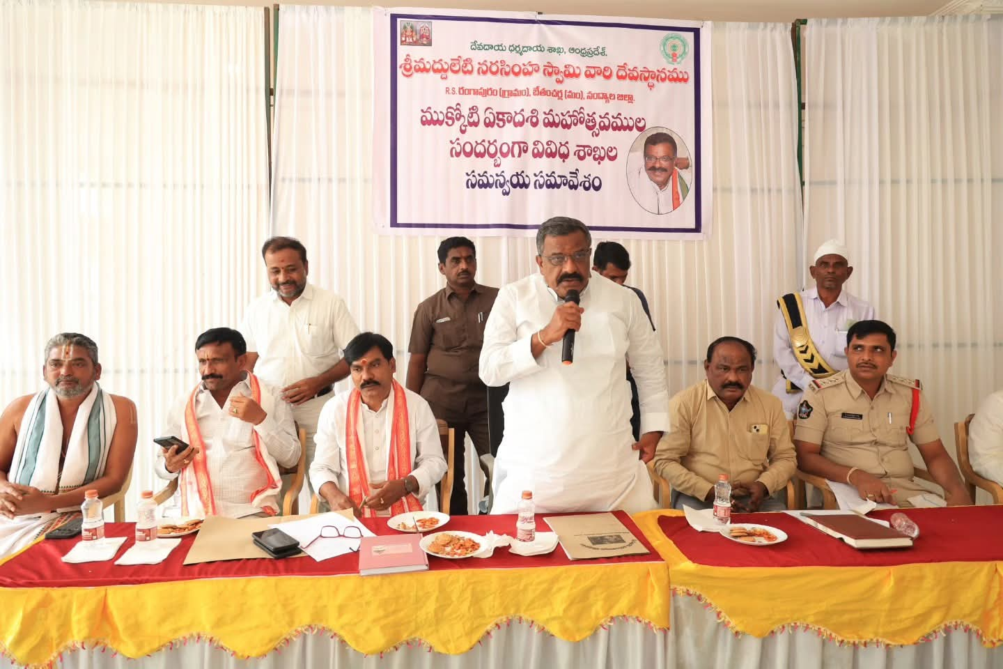 బేతంచెర్ల మండలంలోని ఆర్.ఎస్. రంగాపురం గ్రామ శివారులో ఉన్న ప్రముఖ వైష్ణవ పుణ్యక్షేత్రం శ్రీ ఘన మద్దిలేటి స్వామి దేవస్థానంలో ముక్కోటి ఏకాదశి ఉత్సవాల ఏర్పాట్లపై అధికారులతో సమీక్ష సమావేశం జరిగింది. ఈ సమావేశానికి గౌరవనీయులు డోన్ ఎమ్మెల్యే శ్రీ కోట్ల జయసూర్య ప్రకాష్ రెడ్డి గారు హాజరై, భక్తులకు ఎలాంటి ఇబ్బందులు కలగకుండా అన్ని సౌకర్యాలను పకడ్బందీగా ఏర్పాటు చేయాలని అధికారులను ఆదేశించారు. ఉత్సవాల సమయంలో భద్రత, త్రాగునీరు, పారిశుద్ధ్యం, విద్యుత్ వంటి మౌలిక వసతులపై ప్రత్యేక శ్రద్ధ వహించాలని సూచించారు. అలాగే VIPల కంటే సామాన్య భక్తులకు అధిక ప్రాధాన్యం ఇవ్వాలని స్పష్టంగా తెలిపారు.