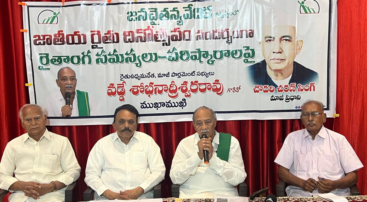 కేంద్ర, రాష్ట్ర ప్రభుత్వాలు వ్యవసాయం రంగం పట్ల అశ్రద్ధ చూపుతూ ఆదాని, అంబానీ లాంటి బడా కార్పొరేట్ శక్తులకు లబ్ధి చేకూరుస్తున్నాయని మాజీ పార్లమెంట్ సభ్యులు, మాజీ వ్యవసాయ శాఖా మాత్యులు వడ్డే శోభనాద్రీశ్వరరావు పేర్కొన్నారు. ఈనెల 23వ తేదీన మాజీ ప్రధాని, భారతరత్న చౌదరి చరణ్ సింగ్ జయంతి సందర్భంగా జాతీయ రైతు దినోత్సవాన్ని పురస్కరించుకుని రైతాంగం సమస్యలు - పరిష్కారాలపై జన చైతన్య వేదిక ఆధ్వర్యంలో ప్రముఖ రైతు ఉద్యమ నేత, మాజీ మంత్రివర్యులు వడ్డే శోభనాద్రీశ్వరరావు తో ముఖాముఖి కార్యక్రమాన్ని నిర్వహించింది. వడ్డే శోభనాద్రీశ్వరరావు ప్రసంగిస్తూ చౌదరి చరణ్ సింగ్ దేశ 5వ ప్రధానిగా, ఉత్తరప్రదేశ్ ముఖ్యమంత్రిగా వ్యవసాయరంగ అభివృద్ధికి అవిరళ కృషి జరిపినారని అన్నారు. భూ సంస్కరణలు అమలు చేయడం, జమీందారీ విధానాన్ని రద్దు చేయడం, కౌలు దారులకు రక్షణ కల్పించే చట్టమును అమలు చేయడం లాంటి సంస్కరణలతో వ్యవసాయ రంగంలో పెను మార్పులు చేశారని గుర్తు చేశారు. నేడు లక్షలాది ఎకరాల పంట భూములను బడా కంపెనీలకు దారాదత్తం చేస్తున్నారని, 16 లక్షల కోట్ల బడా కంపెనీల ఋణాలను రద్దు చేశారని, మరోవైపు బిజెపి పాలనలో గత 11 సంవత్సరాలుగా అప్పుల ఊబిలో కొనసాగుతున్న రైతుల ఋణాలను రద్దు చేయడానికి కేంద్ర, రాష్ట్ర ప్రభుత్వాలు కృషి చేయడం లేదన్నారు. వ్యవసాయ రంగంలో ఉత్పాదకత అల్పంగా ఉందని, వ్యవసాయ పరిశోధనలకు తగిన బడ్జెట్ కేటాయించడం లేదన్నారు. రైతులు పండించిన పంటలకు సరైన గిట్టుబాటు ధర లభించకపోవడం వలన ప్రతిఏటా మూడు లక్షల కోట్ల రూపాయలను రైతులు నష్టపోతున్నారన్నారు. ప్రముఖ వ్యవసాయ శాస్త్రవేత్త ఎం.ఎస్ స్వామినాథన్ రైతులకు గిట్టుబాటు ధర కల్పించాలని ఉత్పత్తి వ్యయానికి 50 శాతం అదనంగా లభించేటట్లు వ్యవసాయ ఉత్పత్తుల ధరలను నిర్ణయించాలని నివేదిక అందిస్తే మోడీ ప్రభుత్వం ఎం ఎస్ స్వామినాథన్ నివేదికను అమలు చేస్తామని పేర్కొని ఆచరణలో అమలు చేయటం లేదన్నారు. చైనా రైతంగానికి ప్రతి ఏటా 15 లక్షల కోట్ల రూపాయల సబ్సిడీ అందిస్తుందని అందులో 10 శాతం కూడా భారత ప్రభుత్వం రైతాంగానికి అందించడం లేదన్నారు. గత 11 సంవత్సరాలల్లో దేశవ్యాప్తంగా లక్ష 50 వేల మంది రైతులు ఆత్మహత్యలు చేసుకున్నారని వివరించారు. జన చైతన్య వేదిక రాష్ట్ర అధ్యక్షులు వల్లంరెడ్డి లక్ష్మణరెడ్డి ప్రసంగిస్తూ భారతదేశ జనాభాలో 46 శాతం మంది వ్యవసాయ రంగంపై ఆధారపడి జీవిస్తూ దేశ జాతీయ ఆదాయంలో కేవలం 15 శాతం మాత్రమే పొందుతున్నారన్నారు. అమెరికా జనాభాలో 1.3 శాతం మాత్రమే ప్రజలు వ్యవసాయ రంగంపై జీవిస్తున్నారని ఆ దేశ జాతీయ ఆదాయంలో ఒక్క శాతం పొందుతున్నారని అన్నారు. భారత దేశ వ్యవసాయ భూమిలో సగం భూమికి నీటిపారుదల సౌకర్యాలు లేవని తద్వారా వ్యవసాయ రంగ ఉత్పాద