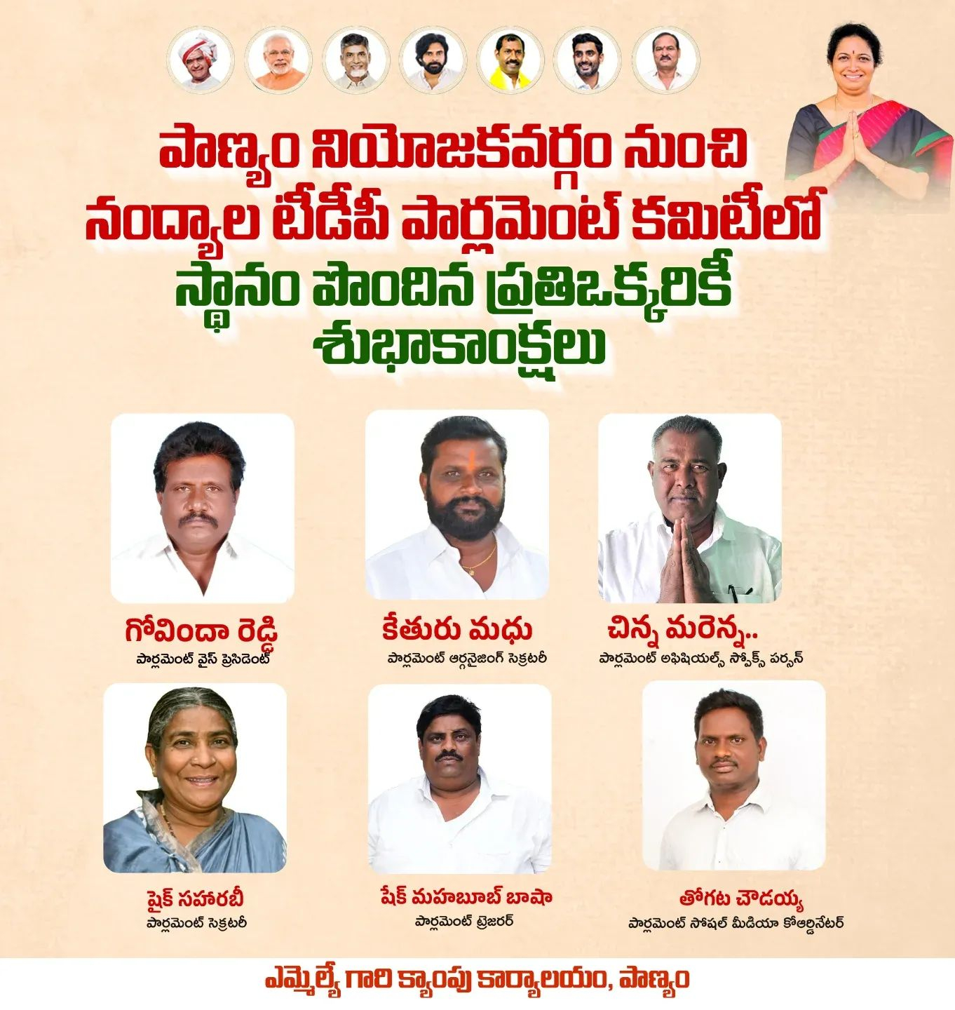తెలుగుదేశం పార్టీ నంద్యాల పార్లమెంట్ కమిటీని ఏర్పాటు చేయడం జరిగింది. నంద్యాల పార్లమెంట్ వైస్ ప్రెసిడెంట్గా ఎం. గోవింద రెడ్డి గారిని, పార్లమెంట్ ఆర్గనైజింగ్ సెక్రటరీగా కేతురు మధు గారిని, పార్లమెంట్ అఫిషియల్ స్పోక్స్పర్సన్గా చిన్న మరెన్న గారిని, పార్లమెంట్ సెక్రటరీగా షైక్ సహారబీ గారిని, పార్లమెంట్ ట్రెజరర్గా షేక్ మహబూబ్ బాషా గారిని, పార్లమెంట్ సోషల్ మీడియా కోఆర్డినేటర్గా తోగట చౌడయ్య గారిని నియమించాం.