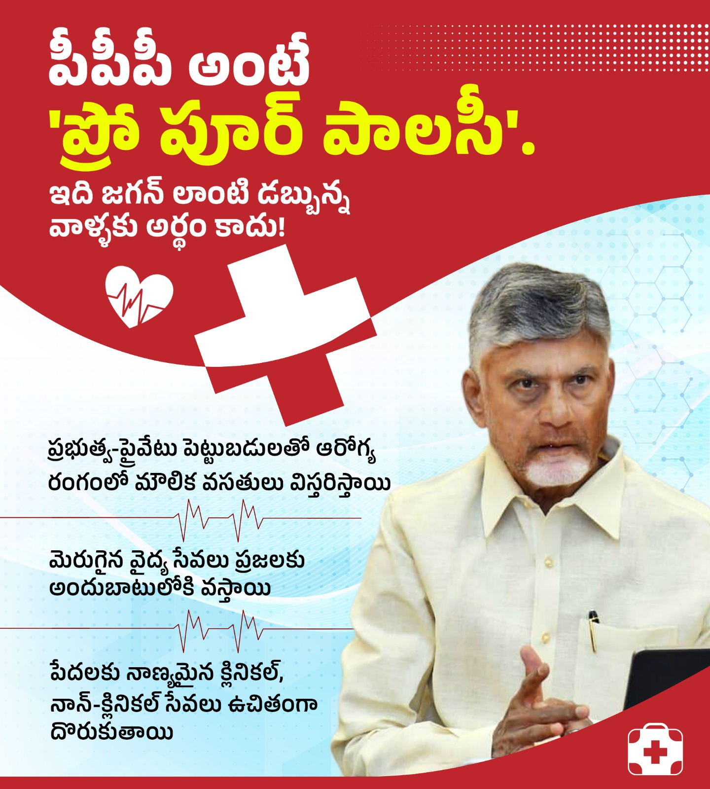పెద్ద ఎత్తున ప్రభుత్వ, ప్రైవేటు భాగస్వామ్య విధానంలో ప్రాజెక్టుల్ని ప్రోత్సహించాలి అంటూ కేంద్ర ఆరోగ్య, కుటుంబ సంక్షేమశాఖ మంత్రి జేపీ నడ్డా రాష్ట్ర ప్రభుత్వానికి లేఖ రాసారు. దేశంలో ఎన్నో వైద్య కళాశాలల నిర్మాణం, ఆసుపత్రుల అభివృద్ధి, రోగనిర్ధారణ సేవలు, సంచార వైద్యం, డయాలసిస్లను పీపీపీ విధానంలో ప్రారంభించామన్నారు.