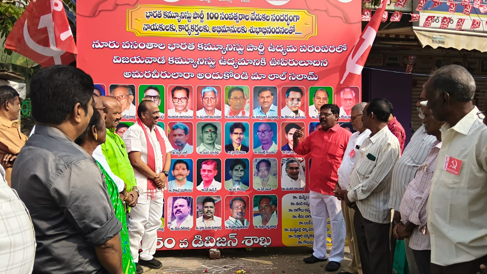 భారత కమ్యూనిస్టు పార్టీ ( సిపిఐ ) శతాబ్ది ఉత్సవాల ముగింపు సందర్భంగా పాతబస్తీ గొల్లపాలెం గట్టు 50 డివిజన్ లో ముగింపు వేడుకలు ఘనంగా జరిగాయి ఈ సందర్భంగా అమరవీరులను స్మరిస్తూ జరిగిన సభకు డివిజన్ పార్టీ కార్యదర్శి మోకా దుర్గారావు ఇలియాస్ చిన్న అధ్యక్షత వహించారు. ఈ సభకు ముఖ్యఅతిథిగా విచ్చేసిన సిపిఐ రాష్ట్ర కార్యవర్గ సభ్యులు ఎన్టీఆర్ జిల్లా కార్యదర్శి దోనేపూడి శంకర్ ప్రసంగిస్తూ భారత స్వతంత్ర సంగ్రామంలో ఇసుమంత పాత్రలేని సంఘపరివార శక్తులు దేశభక్తి గురించి మాట్లాడుతున్నారని ఎద్దేవా చేశారు. బ్రిటిష్ సామ్రాజ్యవాదుల కాళ్ళు మొక్కి కప్పం గట్టి అధికారాన్ని కాపాడుకున్న సంస్థానా దిశలు ఈరోజున బిజెపిలో కేంద్ర మంత్రులుగా, ముఖ్య మంత్రులుగా కీలకమైన స్థానాల్లో ఉన్నారని, దేశం కోసం త్యాగం చేసిన కమ్యూనిస్టులు 1925 డిసెంబర్ 26వ తేదీన కాన్పూర్లో ఎస్వీ ఘాటే ప్రధాన కార్యదర్శిగా సిపిఐ ఏర్పడిందని ఆనాడే సంపూర్ణ స్వతంత్ర నినాదాన్ని ముందుకు తీసుకువెళ్లిందని అన్నారు. స్వాతంత్ర్య పోరాటంలో పాల్గొని కనీసం లాఠీచార్జి దెబ్బలు తిన్న నాయకుడు బిజెపిలో ఒక్కరు కూడా లేరని" దయ్యాలు వేదాలు వలిస్తున్నట్లుగా" భారతీయ జనతా పార్టీ నాయకులు నరేంద్ర మోడీ అమిత్ షాలు దేశభక్తి గురించి మాట్లాడుతున్నారని విమర్శించారు. మహాత్మా గాంధీని చంపిన ఈ దేశభక్తులు దురదృష్టవశాత్తు. ఈ దేశాన్ని పరిపాలిస్తున్నారని మోప్రగల్బాలు పలుకుతున్నారని అర్బన్ నక్సలైట్లు అని ముద్ర వేసి పట్టణ ప్రాంతాల్లో ప్రజల కోసం ప్రజా సమస్యలపై పోరాటం చేసే కమ్యూనిస్టులపై ఉక్కు పాదం మోపాలని చూస్తున్నారని భవిష్యత్తులో కమ్యూనిస్టులు అందరూ కలిసి ఒకే జెండాగా Krne దాల్చాలని అదే కమ్యూనిస్టులుగా అందించేటువంటి నిజమైన నివాళి అన్నారు. రాష్ట్రంలో కూటమి ప్రభుత్వం మోడీ, ప్రభుత్వానికి భాకాలు ఊదుతున్నారని, అదాని ఆంధ్రప్రదేశ్గా ఈ రాష్ట్రాన్ని మార్చటానికి ప్రయత్నాలు జరుగుతున్నాయని ఆ వైపుగా ప్రైవేటీకతవైపు, కార్పొరేట్లవైపు ప్రభుత్వం అడుగులు వేస్తున్నారని విమర్శించారు అనంతరం సిపిఐ నగర కార్యదర్శి వర్గ సభ్యులు తాడిపైడియా ప్రసంగిస్తూ గొల్లపాలెం గట్టు ప్రాంతంలో భారత కమ్యూనిస్టు పార్టీకి మాత్రమే పోరాట చరిత్ర ఉందని, సుఖ మంచి రంగారావు ఎస్ వెంకటేశ్వరరావు కాగితాల కృష్ణమూర్తి కొండ్ర బాబురావు నడకుదిటి హేమరాజ్ మరియు గాడి మాణిక్యాలరావు వంటి వారు ప్రజలతో మమేకమై ఈ ప్రాంతంలో స్థానికంగా అనేక ఉద్యమాలు నిర్మించారని వారి ఆశయ సాధన కోసం ప్రతి ఒక్కరము పునరకితం కావాలని తాడిపడియా అన్నారు