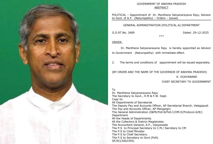 ప్రముఖ ప్రకృతి వైద్య రంగ నిపుణులు డా.మంతెన సత్యనారాయణ రాజును ఏపీ ప్రభుత్వానికి ప్రకృతి వైద్య సలహాదారుగా (Advisor – Naturopathy)