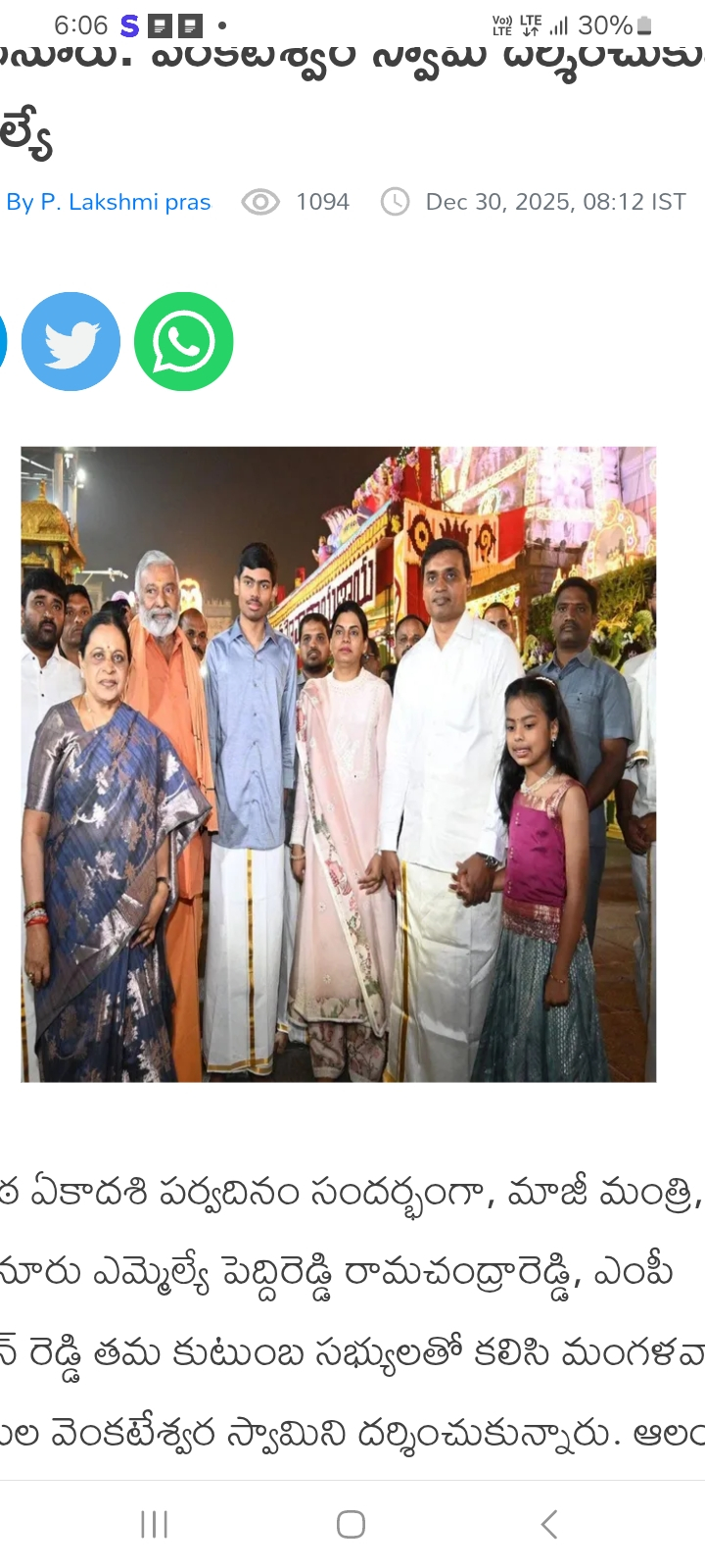 వైకుంఠ ఏకాదశి పర్వదినం సందర్భంగా, మాజీ మంత్రి, పుంగనూరు ఎమ్మెల్యే పెద్దిరెడ్డి రామచంద్రారెడ్డి, ఎంపీ మిథున్ రెడ్డి తమ కుటుంబ సభ్యులతో కలిసి మంగళవారం తిరుమల వెంకటేశ్వర స్వామిని దర్శించుకున్నారు. ఆలయ అధికారులు వారికి ప్రత్యేక దర్శన ఏర్పాట్లు చేశారు. ఈ సందర్భంగా వారు మాట్లాడుతూ, వైకుంఠ ఏకాదశి రోజున స్వామివారిని దర్శించుకోవడం ఎంతో సంతోషంగా ఉందని తెలిపారు # కొత్తూరు ముర .