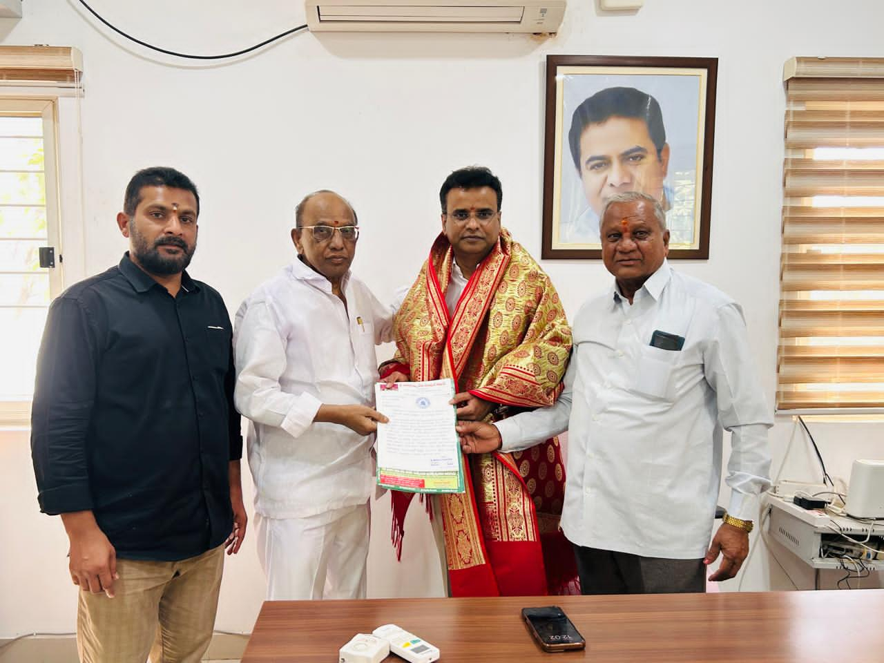 మేడ్చల్ మల్కాజ్గిరి జిల్లా  : - జీడిమెట్ల -132 డివిజన్ పెట్ బషీరాబాద్ లోని ఎమ్మెల్యే  క్యాంప్ కార్యాలయంలో గాజులరామారం చిత్తారమ్మ దేవాలయం కమిటీ సభ్యులు బిఆర్ఎస్ ఎల్పీ విప్, ఎమ్మెల్యే కెపి.వివేకానంద్ ని మర్యాదపూర్వకంగా కలిసి జనవరి 23 నుంచి నిర్వహించే చిత్తారమ్మ జాతర ఏర్పాట్లపై వినతి పత్రం అందజేశారు.