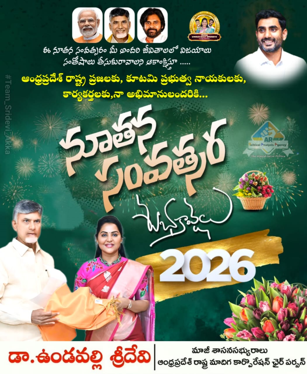 ఈ కొత్త సంవత్సరం మీ అందరి జీవితాల్లో విజయాలు, సంతోషాలు తీసుకురావాలని ఆకాంక్షిస్తూ..... ఆంధ్రప్రదేశ్ రాష్ట్ర ప్రజలకు, కూటమి నాయకులకు, కార్యకర్తలకు నా అభిమానులందరికీ.నూతన సంవత్సర శుభాకాంక్షలు.