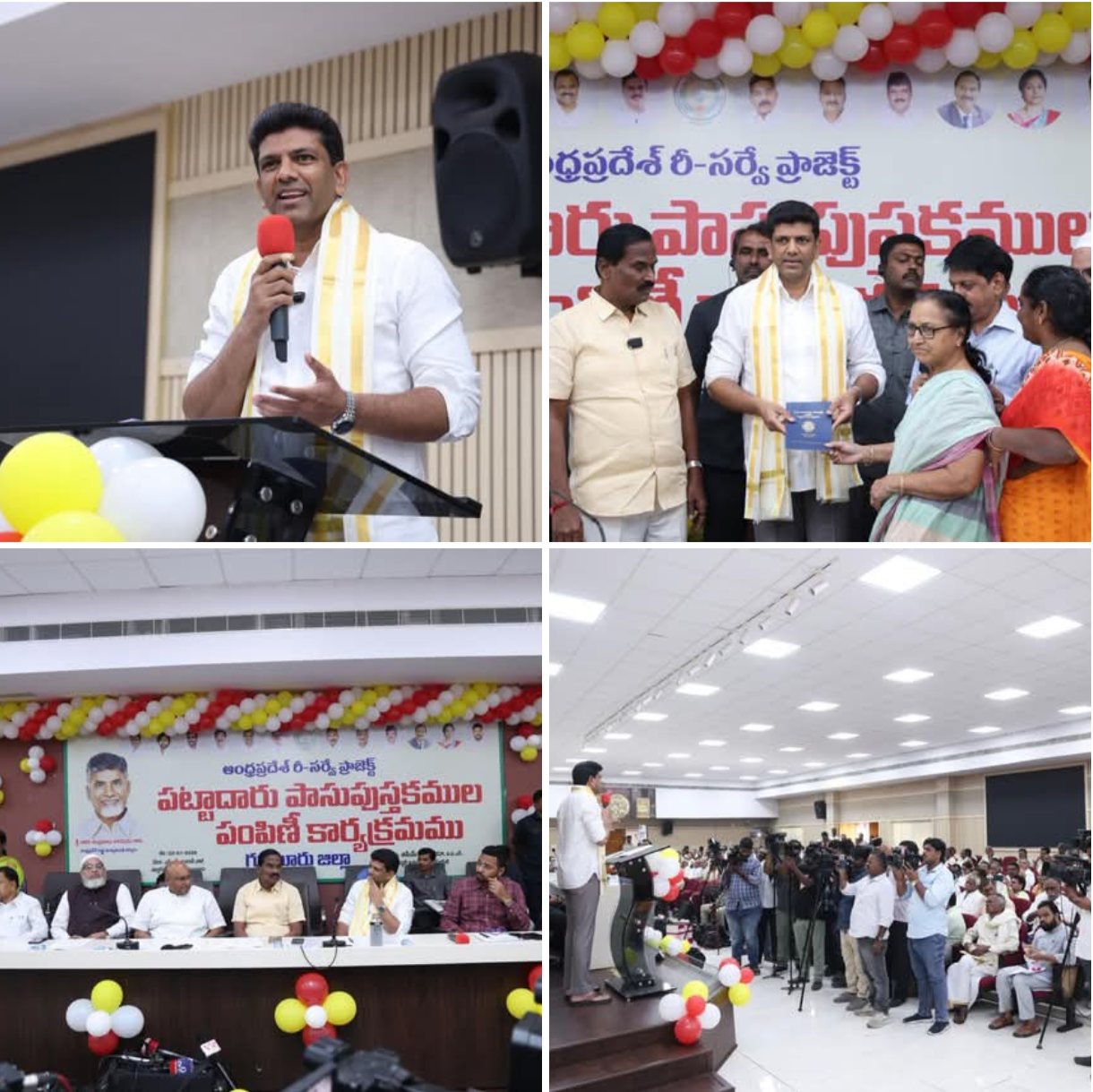 గుంటూరు కలెక్టర్ కార్యాలయంలో జరిగిన పట్టాదారు పాస్ బుక్ పంపిణీ కార్యక్రమ సందర్భంగా భూ రికార్డ్స్ వ్యవస్థలో తీసుకొచ్చిన సంస్కరణలు, సర్వే–రీసర్వే ప్రక్రియలో ఆధునిక సాంకేతికత వినియోగం, డిజిటలైజేషన్ వల్ల కలిగే ప్రయోజనాలను వివరించారు