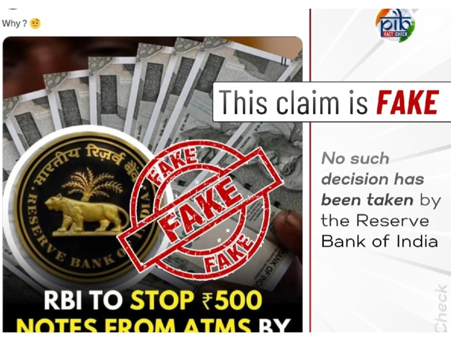 రిజర్వ్ బ్యాంక్ ఆఫ్ ఇండియా ( ఆర్బిఐ) త్వరలో రూ. 500 నోట్లను నుండి నిలిపివేస్తుందని సామాజిక మాధ్యమాల్లో జరుగుతున్న ప్రచారంలో నిజం లేదని పిఐబి ఫ్యాక్ట్ చెక్ విభాగం "ఎక్స్" వేదికగా తెలియజేసింది.