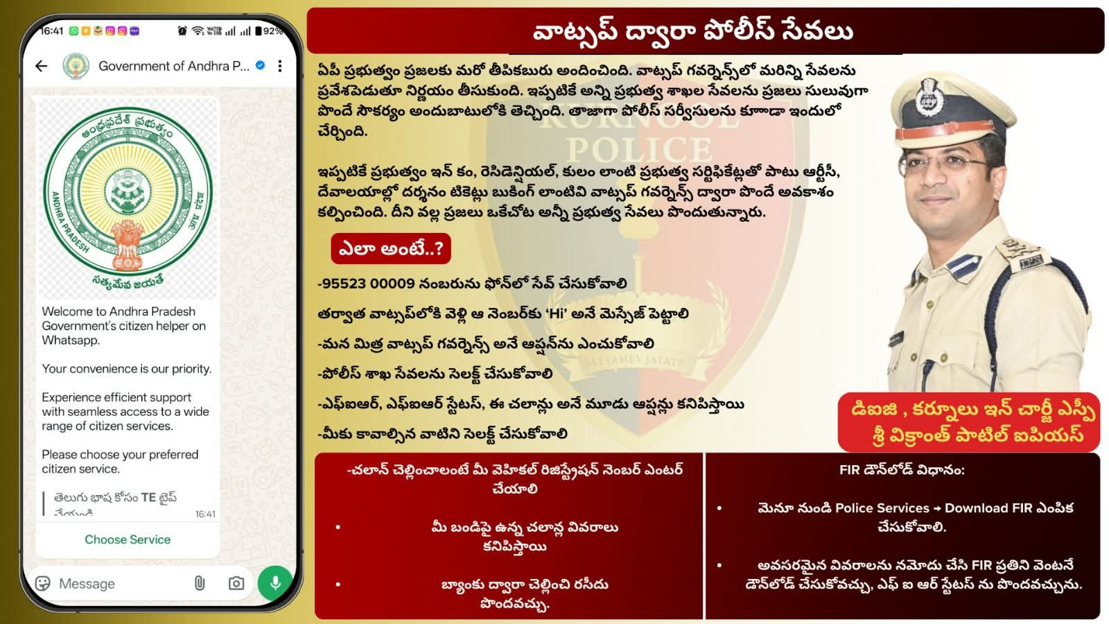 ప్రజలకు మరింత సులభమైన, వేగవంతమైన మరియు పారదర్శకమైన పోలీసు సేవలు అందించాలనే లక్ష్యంతో ఆంధ్రప్రదేశ్ ప్రభుత్వం ప్రవేశపెట్టిన వాట్సాప్ గవర్నెన్స్ – “ *మన మిత్ర”* సేవలను విస్తృతంగా వినియోగించుకోవాలని డిఐజి,   కర్నూలు  జిల్లా ఇన్ చార్జీ  ఎస్పీ శ్రీ విక్రాంత్ పాటిల్ ఐపియస్  గారు జిల్లా ప్రజలకు సోమవారం  విజ్ఞప్తి చేశారు.