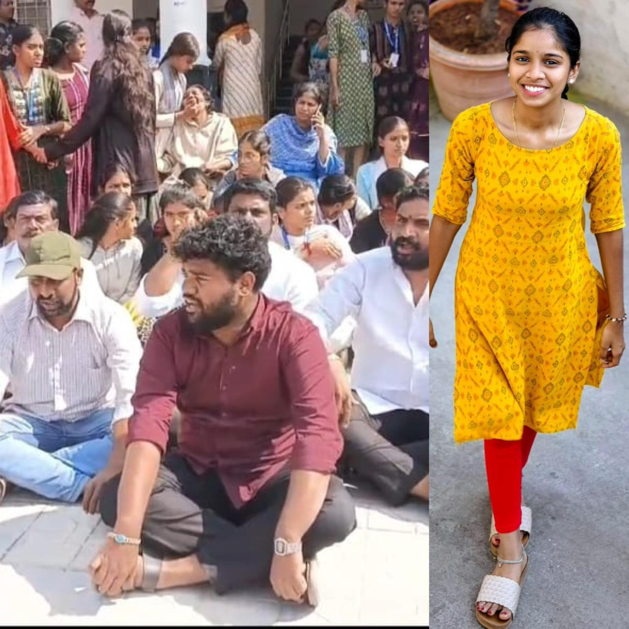 దారుణంగా ప్రవర్తించి వర్షిణి మృతికి కారణమైన లెక్చరర్ ల పై చర్యలు తీసుకోవాలని కాలేజ్ ముందు కూర్చుని ధర్నా చేస్తున్న కుటుంబ సభ్యులు.