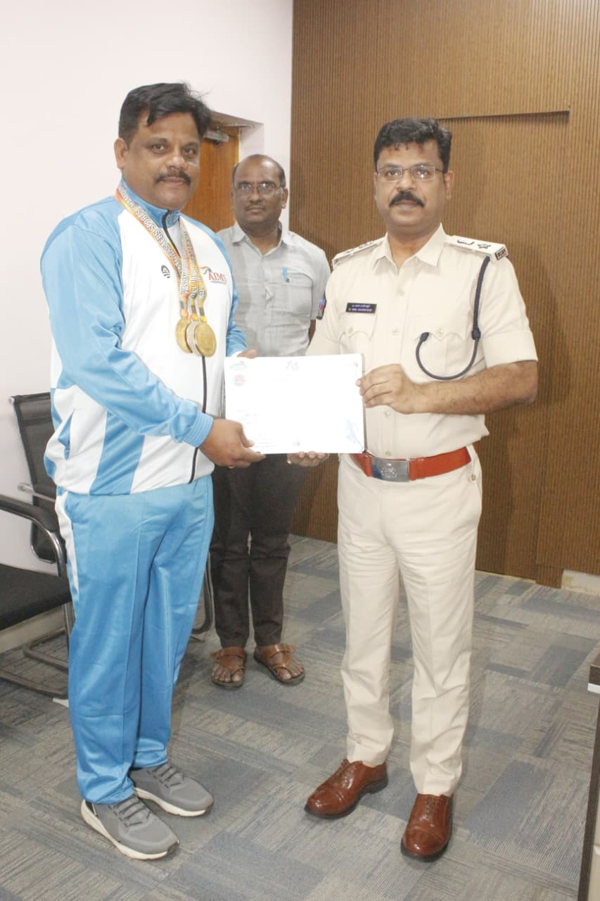జాతీయ స్థాయిలో జరిగిన ఆల్ ఇండియా మాస్టర్స్ స్పోర్ట్స్ ఛాంపియన్షిప్ – 2026లో మూడు పతకాలు సాధించి, అంతర్జాతీయ స్థాయిలో జరిగే క్రీడా పోటీలకు ఎంపికైన బాపట్ల జిల్లా స్పెషల్ బ్రాంచ్ విభాగంలో విధులు నిర్వహిస్తున్న హెడ్ కానిస్టేబుల్ సిహెచ్. నాగరాజును జిల్లా ఎస్పీ శ్రీ బి. ఉమామహేశ్వర్ ఐపీఎస్ గారు ప్రత్యేకంగా అభినందించారు. హెడ్ కానిస్టేబుల్ నాగరాజు శుక్రవారం జిల్లా పోలీస్ ప్రధాన కార్యాలయంలో జిల్లా ఎస్పీ గారిని మర్యాదపూర్వకంగా కలిసి, హైదరాబాద్ గచ్చిబౌలి స్టేడియంలో జరిగిన జాతీయ స్థాయి క్రీడలలో గెలుపొందిన పతకాలు, సర్టిఫికెట్లను చూపించారు. ఈ సందర్భంగా జిల్లా ఎస్పీ గారు అతడిని పతకాలతో సత్కరించి, ప్రశంసా పత్రాన్ని అందజేసి ప్రత్యేకంగా అభినందనలు తెలిపారు.
