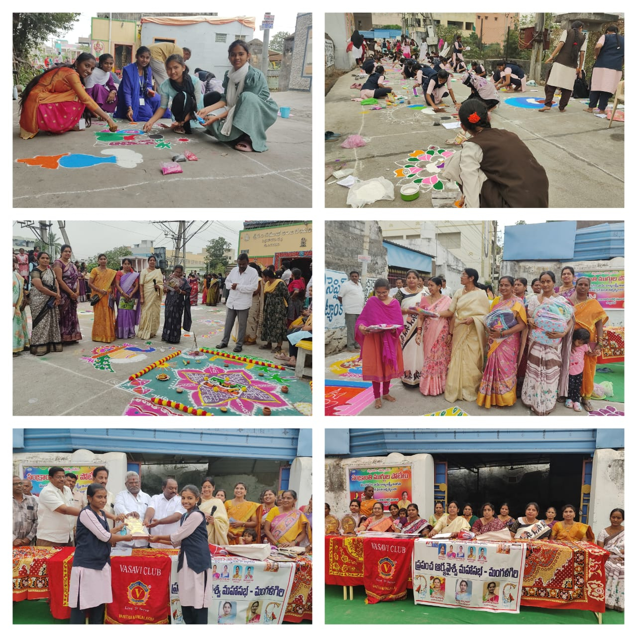 మంగళగిరి వామ్ (ప్రపంచ ఆర్యవైశ్య మహాసభ) రాజ్యలక్ష్మి ఆవోపా, వాసవి క్లబ్ వనిత సంయుక్త ఆధ్వర్యంలో శనివారం నగరంలోని పెదకోనేరు వద్ద మహిళలకు ముగ్గుల పోటీలు నిర్వహించారు. కోఆర్డినేటర్ గాదంశెట్టి సుజాత ఆధ్వర్యంలో జరిగిన ఈ కార్యక్రమానికి ముఖ్య అతిథులుగా వామ్ ఆంధ్రప్రదేశ్ విభాగ రాష్ట్ర అధ్యక్షులు దేవతి భగవ న్నారాయణ, ఆర్యవైశ్య సంఘాల సమాఖ్య మంగళగిరి అధ్యక్షులు సంకా బాలాజీ గుప్తా, మాజేటి సూర్య వేణుగోపాలకృష్ణ శ్రేష్టి రామానుజ దాస, మద్దుల శివ శంకర ప్రసాద్, డోగిపర్తి శ్రీనివాసరావు, గాదంశెట్టి రామకృష్ణ, డాక్టర్ పి.గిరిజ, దివ్వెల ఆదిలక్ష్మి, మద్ది భాగ్యలక్ష్మి, నేరెళ్ల పద్మజ, నేరెళ్ల లక్ష్మీ రాధిక, నేరెళ్ల పద్మజ, వనమా గీతాదేవి, కాళంగి శరణ్య, పారేపల్లి అరుణ, తాడేపల్లి హేమలత, మాజేటి కుమారి, ప్రియాంక, పొట్టి మల్లేశ్వరి తదితరులు పాల్గొన్నారు. అనంతరం బహుమతి ప్రధానోత్సవం జరిగింది. మొదటి బహుమతి ఎస్ సౌభాగ్య లక్ష్మి, రెండో బహుమతి పి. భవాని, మూడవ బహుమతి ఎం. వర్షిత, కన్సోలేషన్ బహుమతి వి. లీలా మానస కు ముఖ్య అతిథులు అందజేశారు. ఈ ముగ్గుల పోటీల్లో విష్ణు విద్యాసంస్థల విద్యార్థినులు 100 మందికి పైగా పాల్గొన్నారు. పోటీల్లో పాల్గొన్న ప్రతి ఒక్కరికి ప్రోత్సాహక బహుమతులు అందజేశారు.