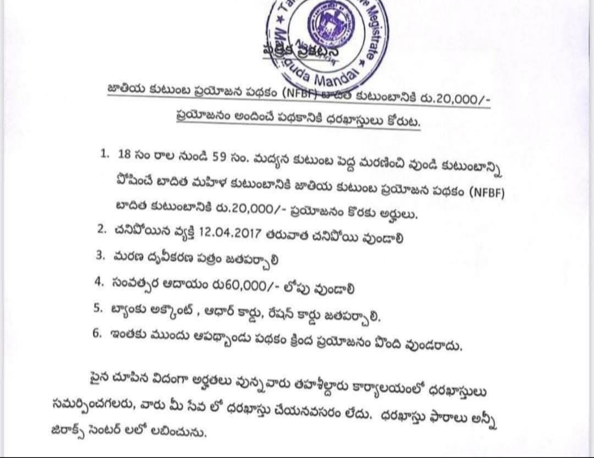 కేంద్ర ప్రభుత్వం భర్త మరణించిన వితంతువులకు కుటుంబ ప్రయోజన పథకం కింద బాధిత కుటుంబానికి Rs.20000/- ప్రయోజనం అందించే పథకనీకి దరఖాస్తు ఎవరైనా ఈ దరఖాస్తు అర్హులుంటే ఈ పథకాన్ని ఉపయోగ చేసుకోగలరు మనకు తెలిసినవారు ఎవరు అయినా తెలియజేయండి.