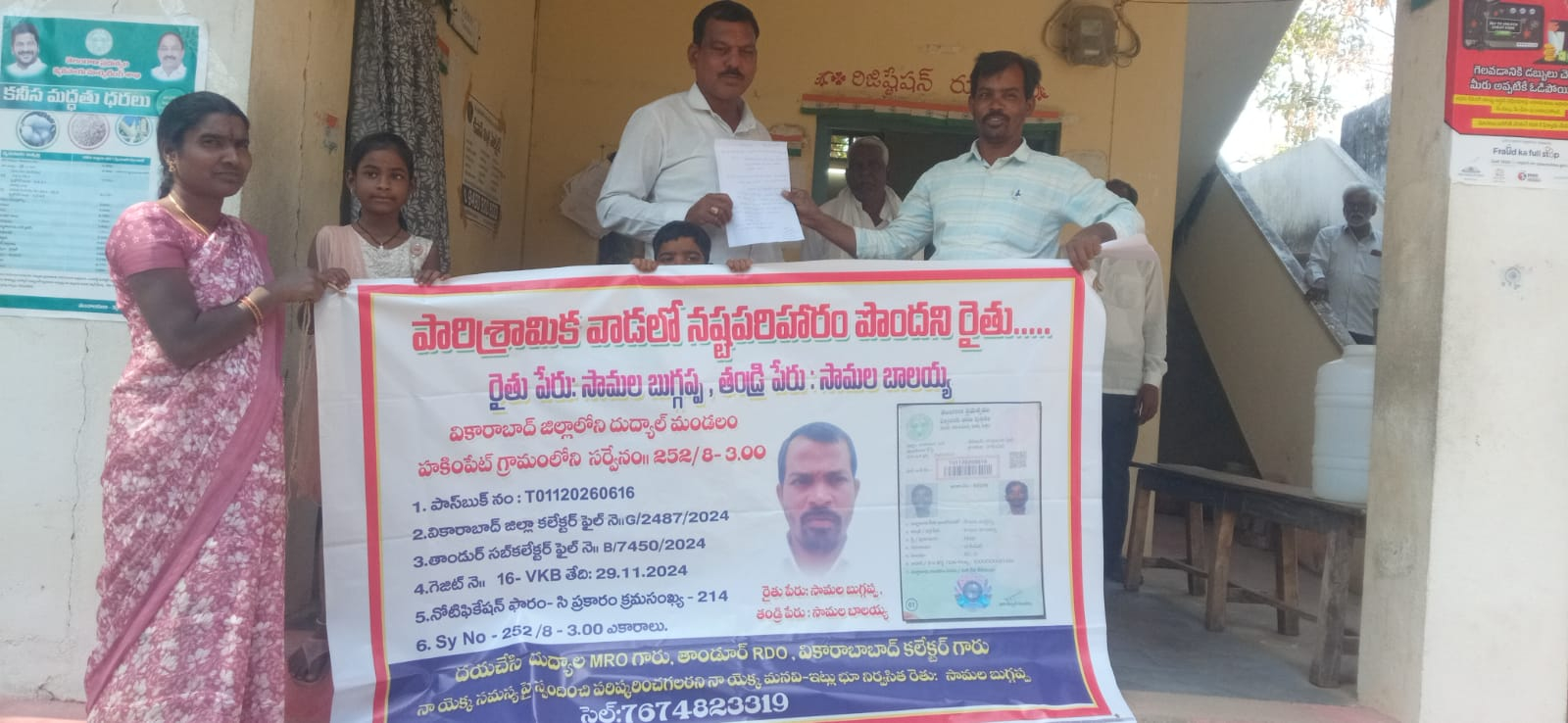 వికారాబాద్ జిల్లా కోడంగల్ నియోజకవర్గం దుద్యాల మండలం హకింపేట్,పోలేపల్లి గ్రామాలలో రాష్ట్ర ప్రభుత్వం ఇటీవల పారిశ్రామిక వాడ ఏర్పాటు కోసం రైతుల నుండి భూసేకరణ చేపట్టారు రైతులకు నష్ట పరిహారం కూడా అందించడం జరిగింది.కానీ హకింపేట్ గ్రామానికి చెందిన సామల బుగ్గప్ప తండ్రి సామల బాలయ్య అనే రైతుకు హకింపేట్ గ్రామంలో సర్వే నెంబర్ 252/8 లో 3.00 ఎకరాల భూమి కలదు ఇట్టి భూమిని రైతు సామల బుగ్గప్ప ప్రభుత్వనికి వికారాబాద్ జిల్లా కలెక్టర్ ఫైల్ నెంబర్ G/2487/2024,తాండూర్ సబ్ కలెక్టర్ ఫైల్ నెంబర్ B/7450/2024,గెజిట్ నెంబర్ 16-వికారాబాద్ తేది 29.11.2024,నోటిఫికేషన్ ఫారం-సి ప్రకారం క్రమసంఖ్య-214 ప్రకారం అప్పచెప్పినారు.అయినను సామల బుగ్గప్ప అనే రైతుకు నేటివరకు ప్రభుత్వం నుండి ఎలాంటి పరిహారం అందలేదు కావున నిన్న తేది 12.01.2026 నాడు రైతు దుద్యాల తహసీల్దార్ కార్యాలయం ముందు తమకు న్యాయం చేయాలి అని బ్యానర్ కట్టి వికారాబాద్ జిల్లా కలెక్టర్ తాండూర్ ఆర్డివో దుద్యాల తహసీల్దార్ స్పందించి నష్ట పరిహారం అందేలా న్యాయం చేయాలి అని వినూత్న నిరసన తెలిపారు.ఇప్పటికైనా అధికారులు స్పందిస్తారా లేదా అని వేచి చూడాలి మరి
