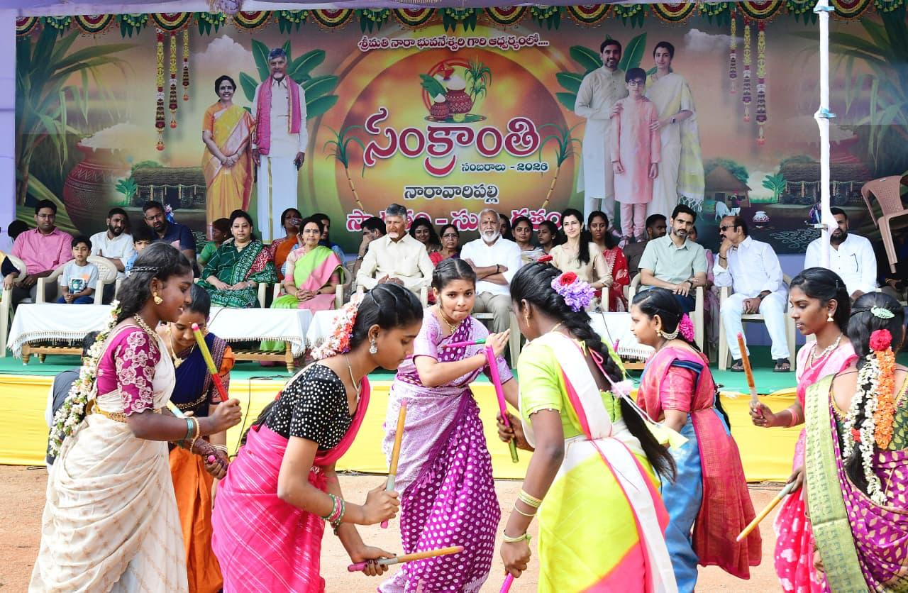 నారావారిపల్లె: తిరుపతి జిల్లా చంద్రగిరి మండలం నారావారిపల్లెలో నిర్వహించిన సంక్రాంతి సంబరాల్లో సీఎం చంద్రబాబునాయుడు, కుటుంబ సభ్యులతో కలిసి విద్య, ఐటీ శాఖల మంత్రి నారా లోకేష్ పాల్గొన్నారు. ముందుగా టీటీడీ కళ్యాణ మండపంలో నిర్వహించిన ముగ్గుల పోటీలను తిలకించారు. అనంతరం స్థానికంగా వివిధ పాఠశాలల విద్యార్థినీ, విద్యార్థులతో నిర్వహించిన క్రీడా పోటీలను వీక్షించారు. క్రీడా పోటీలు ఆద్యంతం ఆసక్తికరంగా సాగాయి. వివిధ క్రీడా పోటీల్లో విజేతలుగా నిలిచిన విద్యార్థినీ, విద్యార్థులకు సీఎం నారా చంద్రబాబునాయుడు, భువనేశ్వరి బహుమతులు అందజేశారు. ఈ వేడుకల్లో భాగస్వాములైన ఉపాధ్యాయులు, ఇతర సిబ్బందిని ఘనంగా సన్మానించారు. విద్యార్థినీ, విద్యార్థులు, ఉపాధ్యాయులు, సిబ్బందితో కలిసి గ్రూప్ ఫోటోలు దిగారు. ఈ కార్యక్రమంలో నారా బ్రాహ్మణి, తేజస్విని, ఎంపీ శ్రీ భరత్, నారా రోహిత్, నారా, నందమూరి కుటుంబ సభ్యులతో పాటు చంద్రగిరి ఎమ్మెల్యే పులివర్తి నాని, శ్రీకాళహస్తి ఎమ్మెల్యే బొజ్జల సుధీర్ రెడ్డి, శాప్ ఛైర్మన్ అనిమిని రవినాయుడు తదితరులు పాల్గొన్నారు.