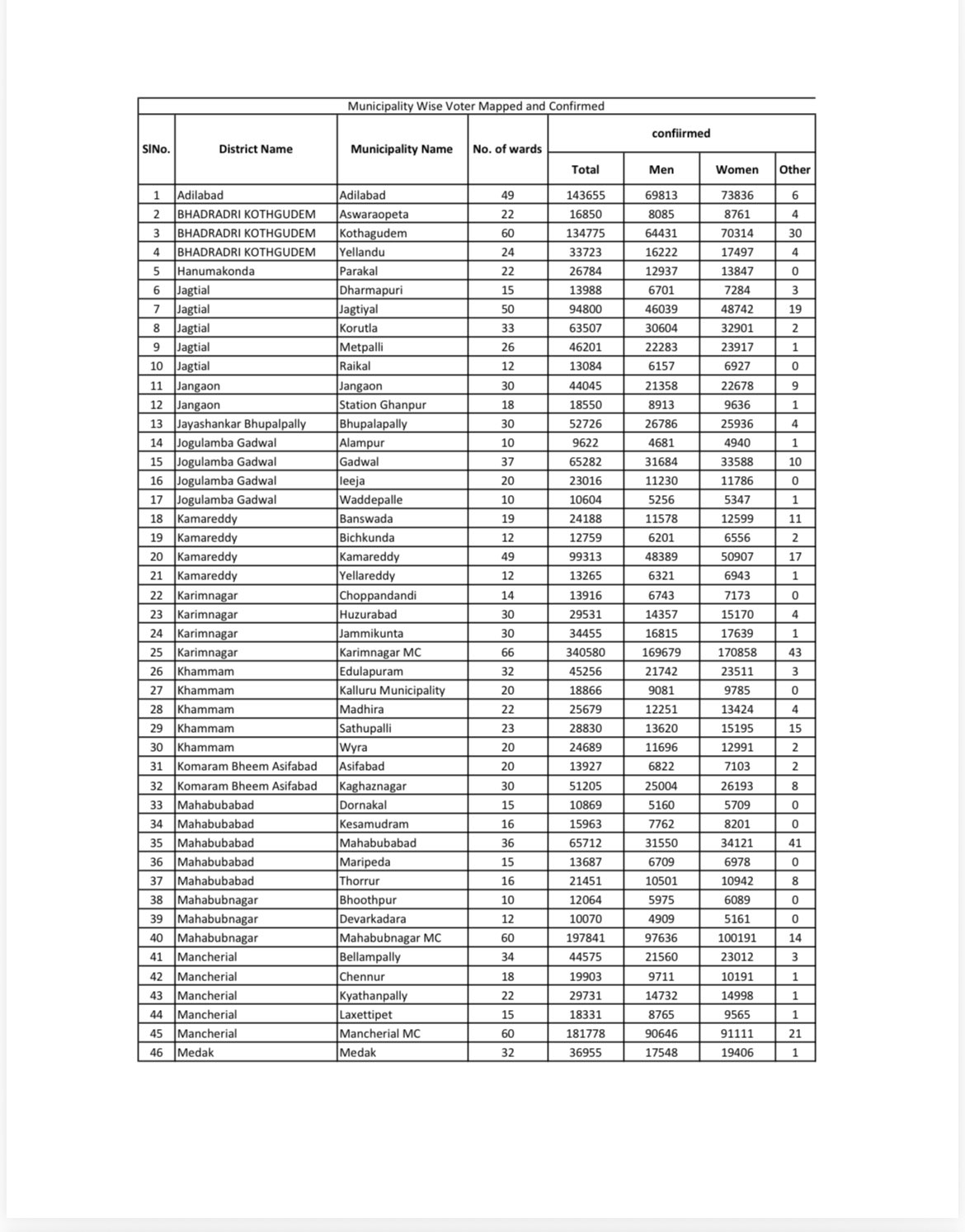 Telangana Municipality Voter Stats 2026