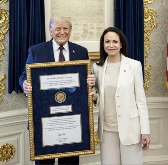 డొనాల్డ్ ట్రంప్ను కలిసిన వెనెజువెలా విపక్షనేత మరియా మచాడో, తనకు బహూకరించిన నోబెల్ పురస్కారం ట్రంప్నకు అందజేత, వెనెజువెలా భవిష్యత్పై ట్రంప్తో చర్చించా, తమ దేశ ప్రజలు స్వేచ్ఛ కోసం ట్రంప్పై ఆధారపడొచ్చు-మచాడో, మచాడోతో సమావేశం కావడం గొప్ప విషయం-డొనాల్డ్ ట్రంప్, ఎన్నో కష్టాలను ఎదుర్కొన్న గొప్ప మహిళ మరియా కొరినా మచాడో, కొరినా మచాడోకు కృతజ్ఞతలు తెలిపిన అమెరికా ప్రెసిడెంట్ ట్రంప్....i